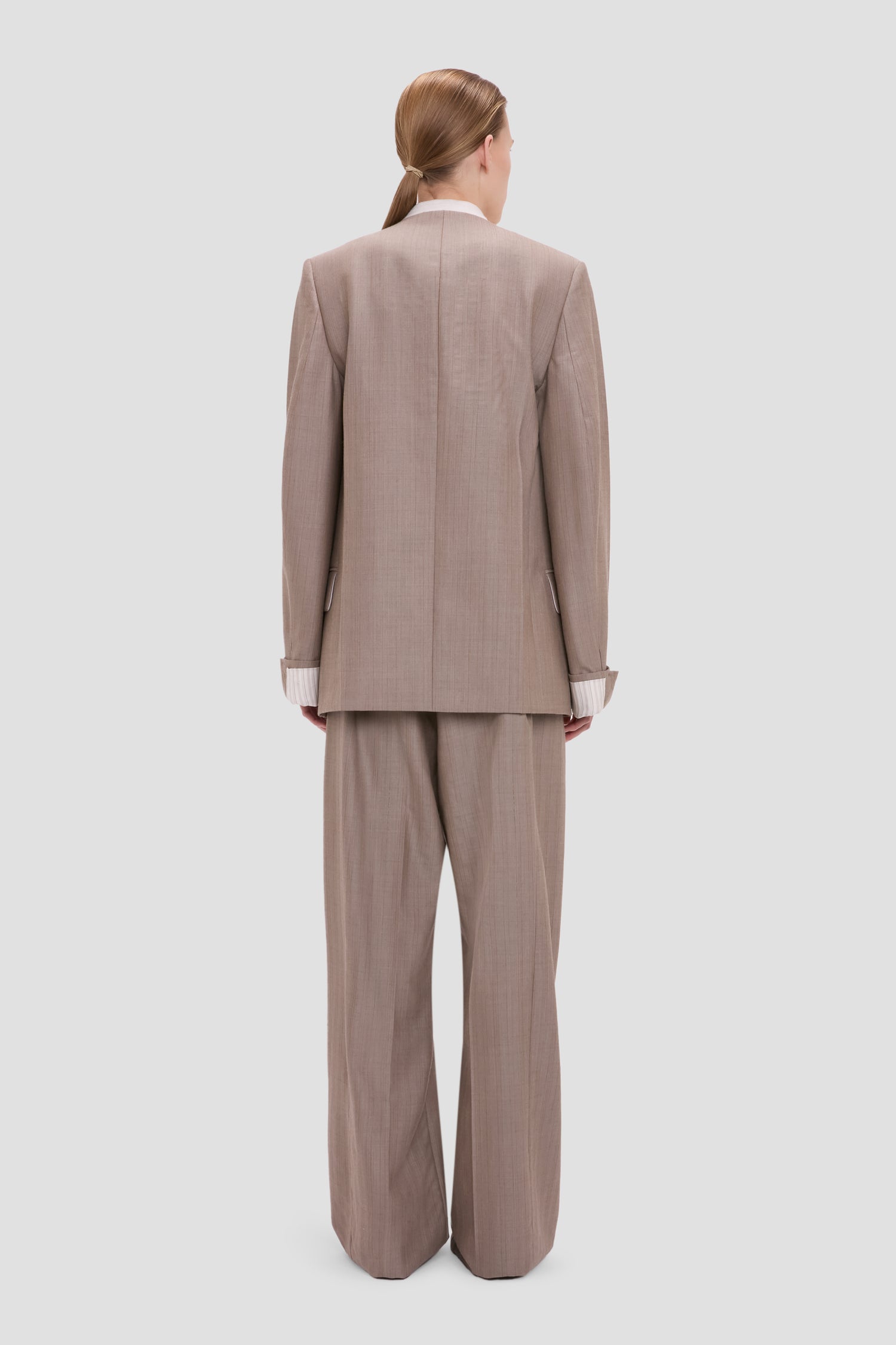 The fully lined Collarless Jacket is meticulously tailored from a light herringbone fabric and finished with a half double-breasted cut. Defined by its collarless neckline and oversized shoulder, it is seat length and is presented in a versatile Limestone colourway.