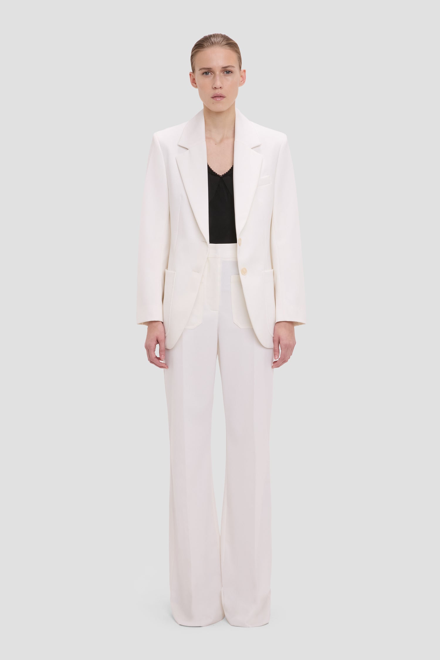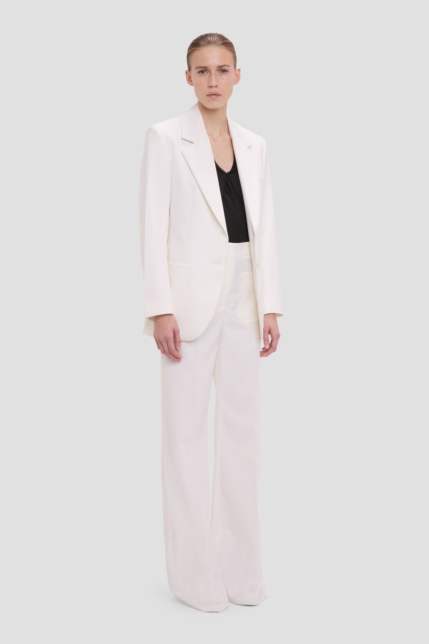 The fully-lined Katherine Jacket is single-breasted and hip length with a standard shoulder silhouette. Discreet detailing on the jacket melton reflects the house’s signature finesse, while patch pockets add a subtle 1970s reference.