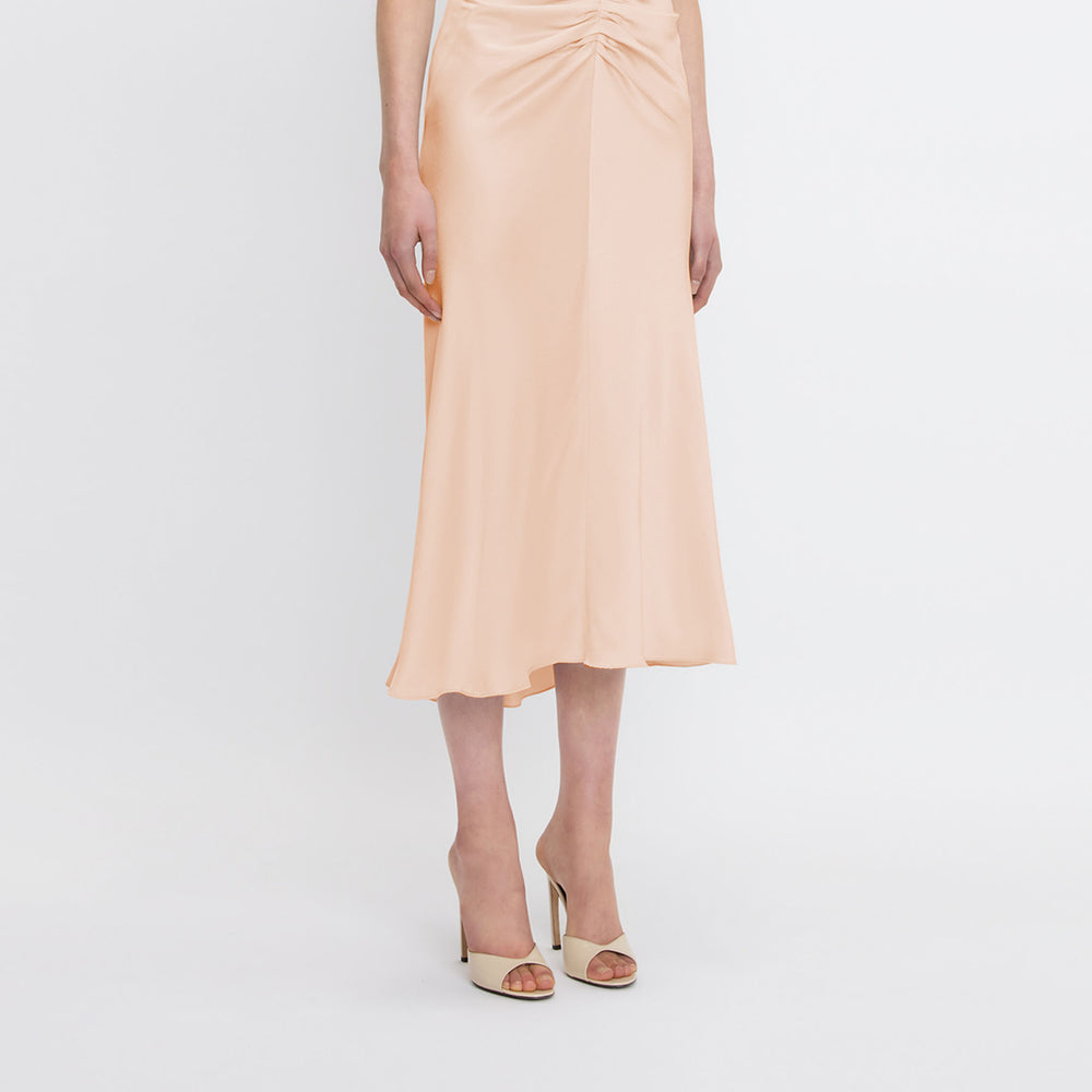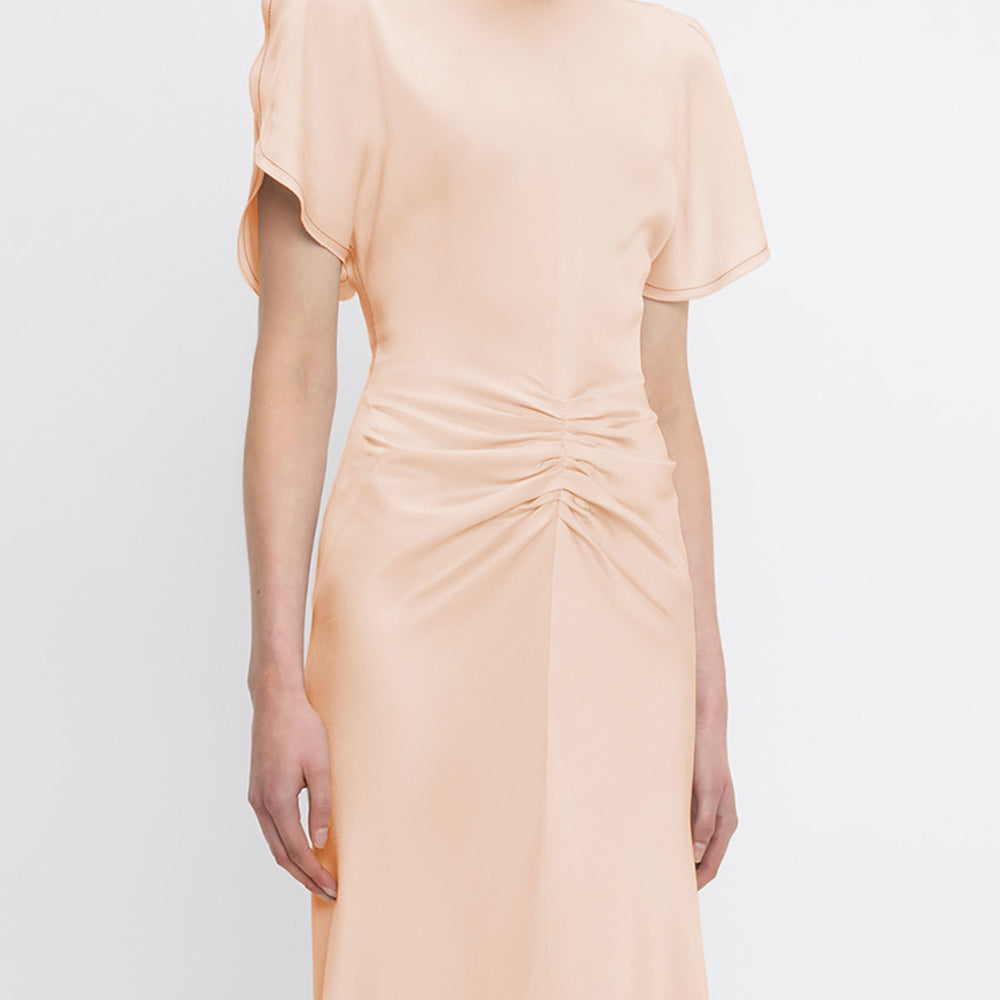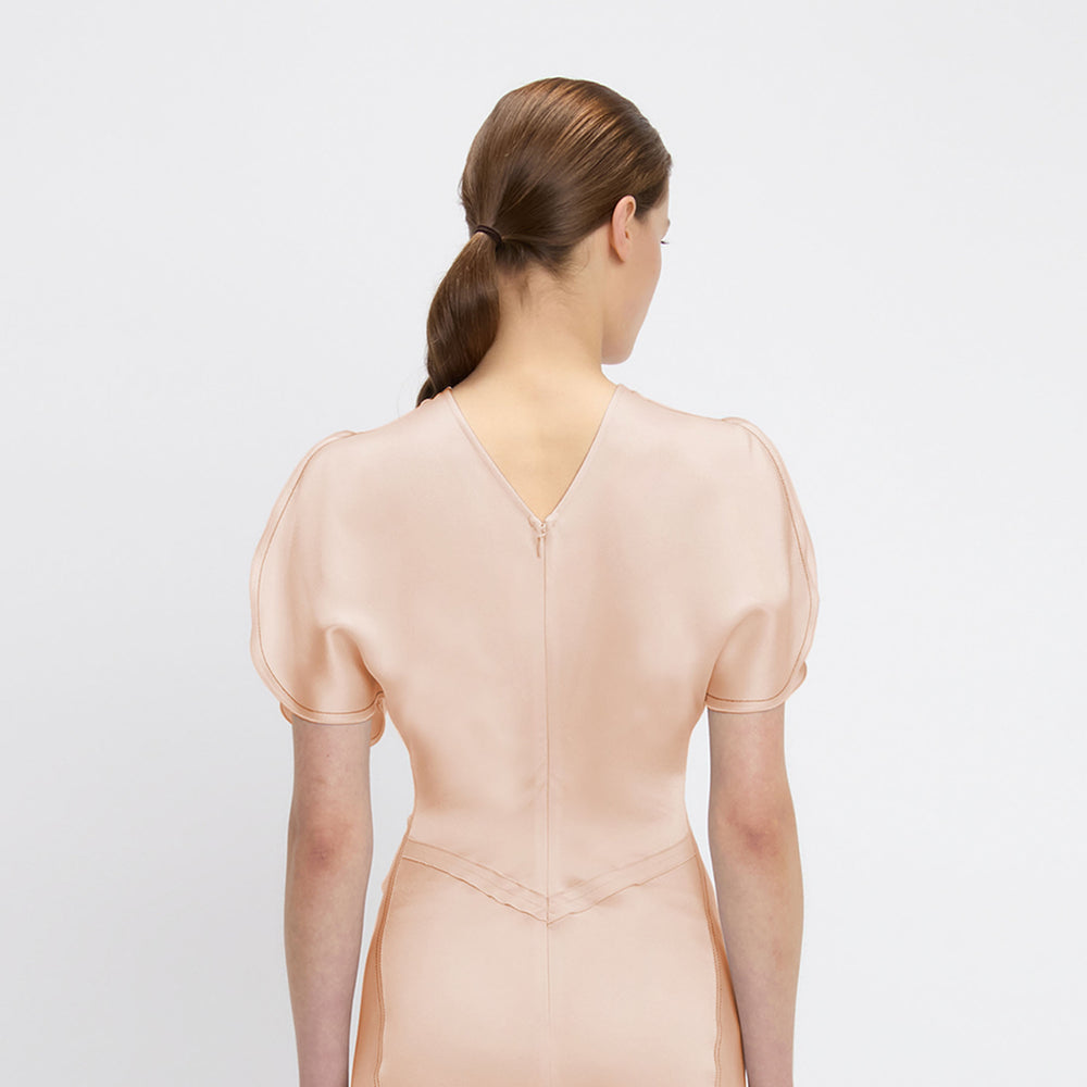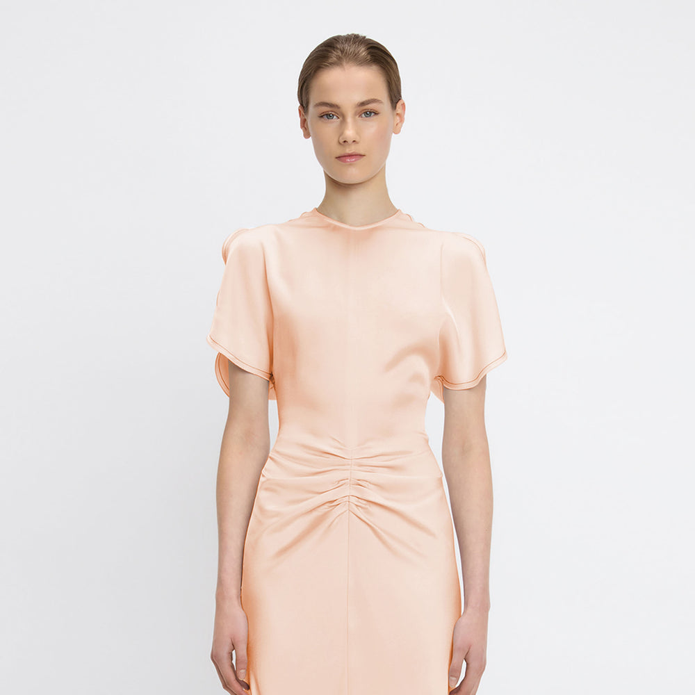 Crafted from crepe back satin, the Bela Midi Dress in Blossom has an effortless drape with tactile pleating at the waist. A V-shape neckline at the back adds a discreet but directional design detail, while the round front neckline and midi-length hemline look polished and professional.