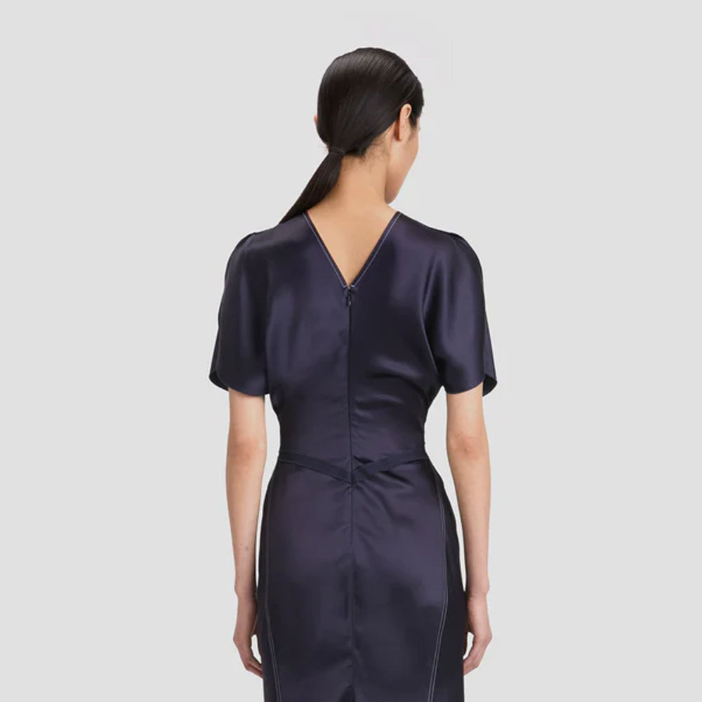 Shaped at the waistline with a more relaxed fit through the bodice, the Bela Midi Dress has a flattering and informal silhouette. Pleat details at the front waist and shoulders bring texture, while hard press details through the skirt and back shoulder add subtle structure. Presented in versatile Midnight, it features elevated finishing touches such as exposed seams, a contrasting topstitch and a longer-length hemline at the back.