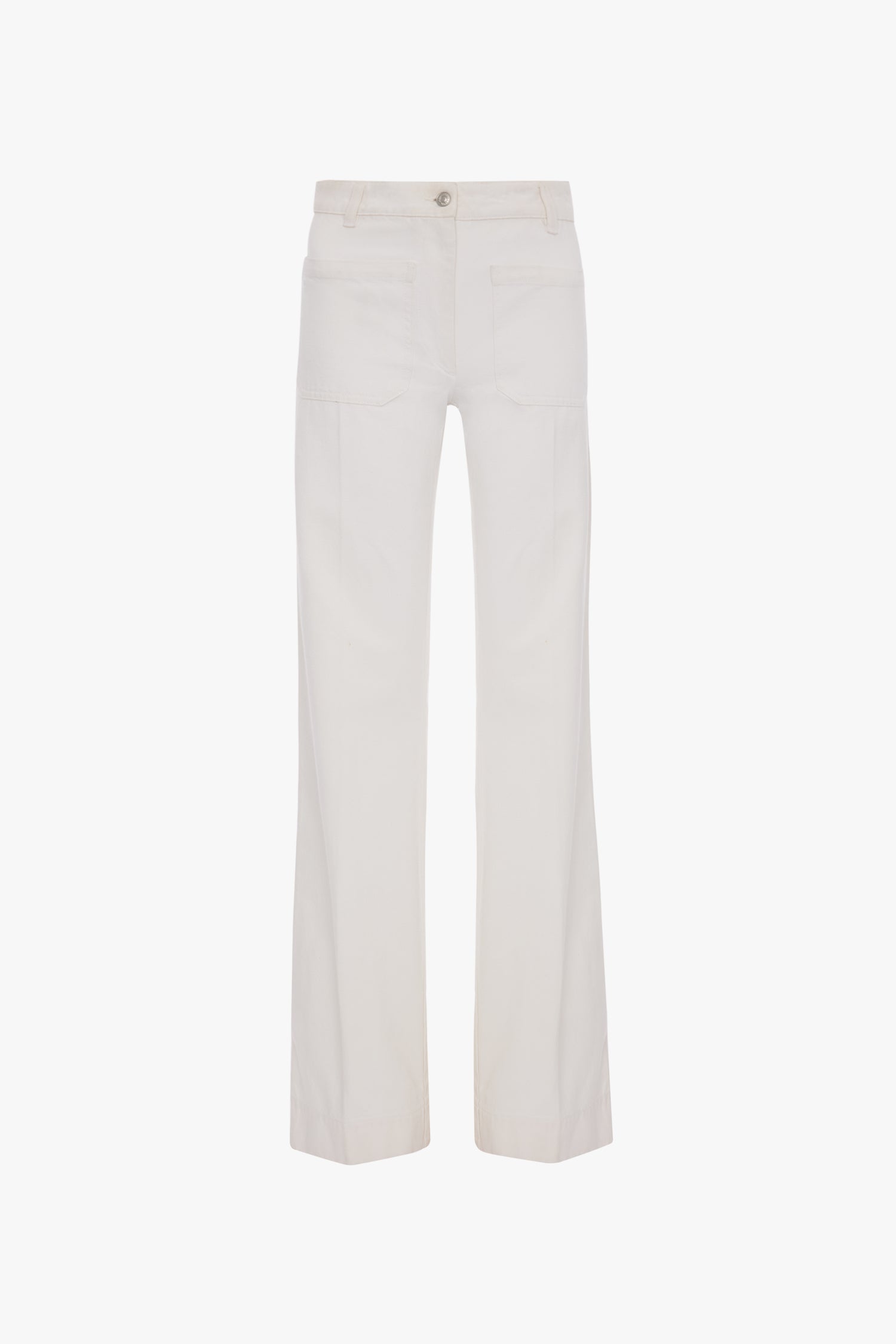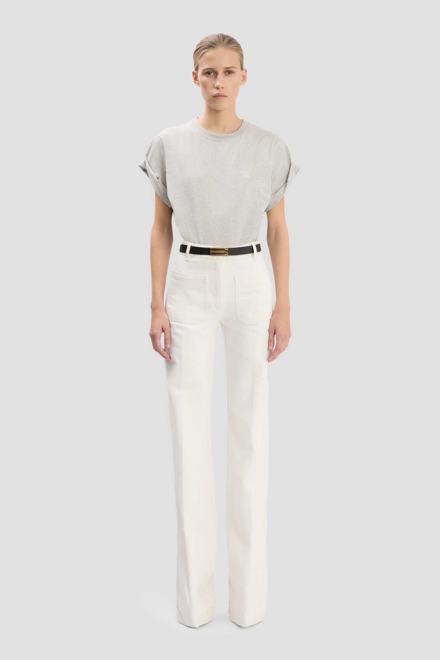 Crafted from stretch denim, the house’s signature Alina Jeans are presented in Washed White for a preppy take on utilitarian denim. A high waist and wide leg nod to a classic 1970s silhouette, while traditional patch pockets, a leather patch and Victoria Beckham embroidered logo complete the look.