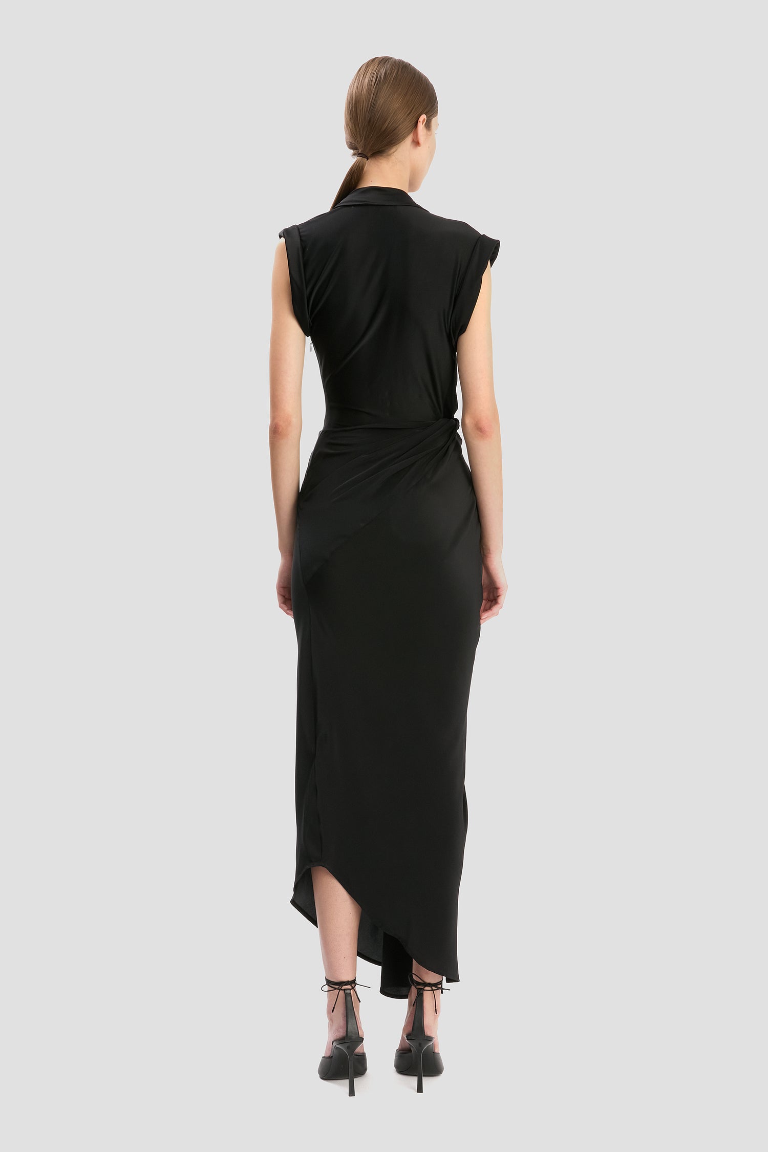 A reimagining of the classic little black dress, the Asymmetric Twist Dress has a wrap-front neckline with button closure, front skirt split and directional asymmetric hemline. Tactile talking points, including a short sleeve with rolled hemline, twisted drape neckline and high-shine bodice, bring a subtle sensuality to this polished but provocative midi dress.