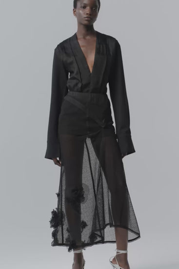 Designed with a mesh outer layer and crepe de chine under layer, the Basque Midi Skirt in Black has curved panel seams for a distinctive silhouette. With its basque waistline and pretty organza flowers, it marries feminine design codes with contemporary flair.