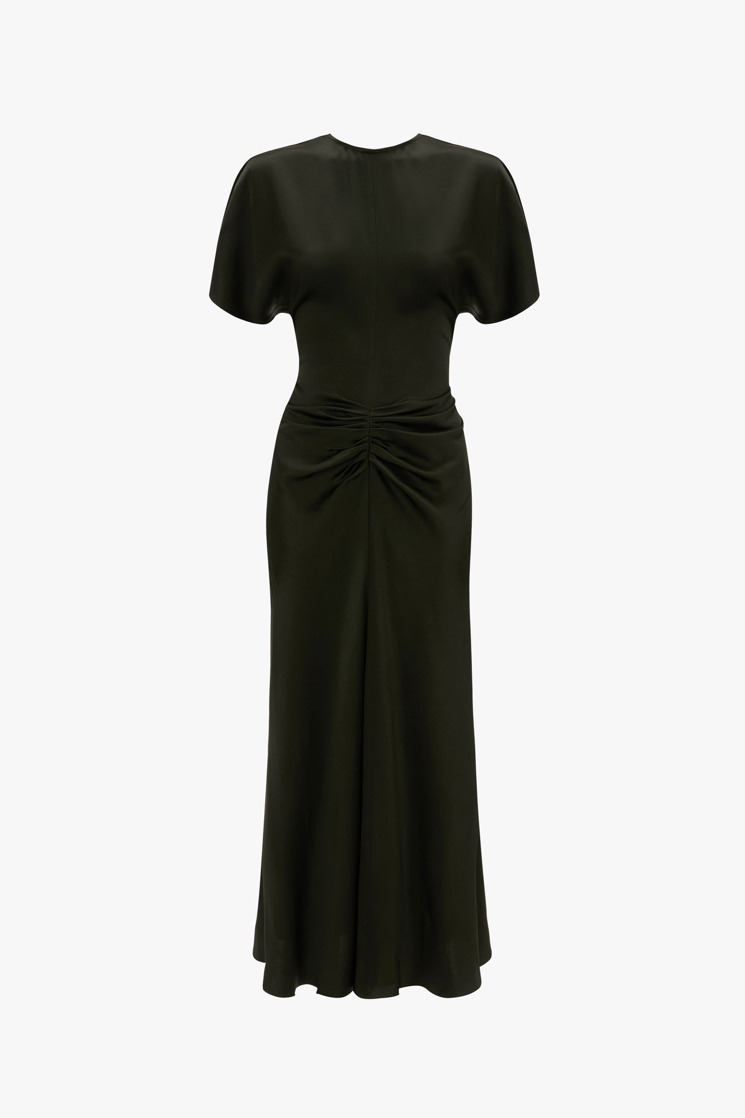 The Bela Midi Dress delivers a professional and polished aesthetic. Presented in dark olive, it has a waist and hip-hugging cut and a fluid skirt with a longer-length hem at the back. A pleated detail at the waist adds a sensuous point of interest, while a V-shape waist seam at the back is mirrored by a subtle V-shape neckline, also at the back.
