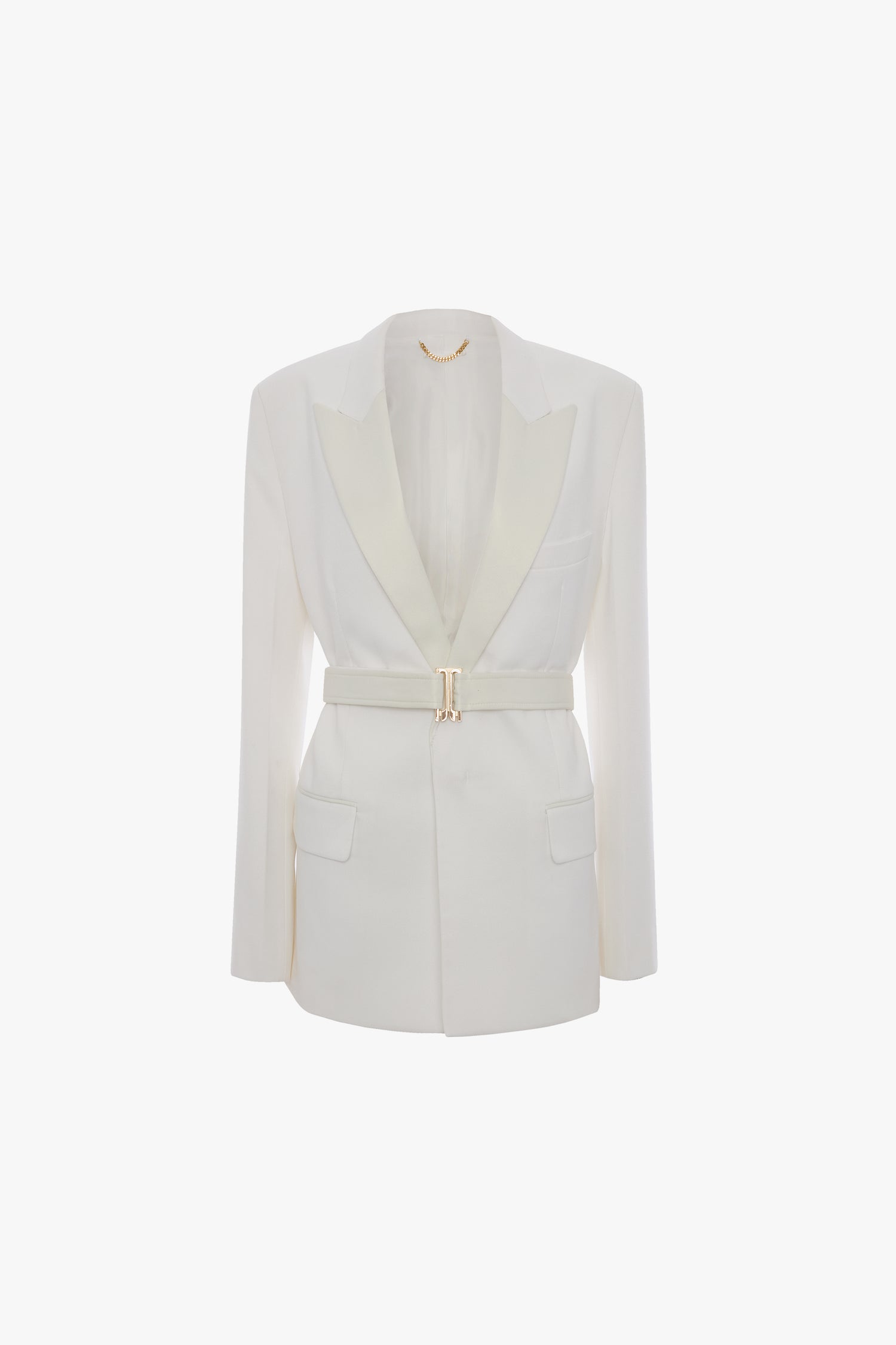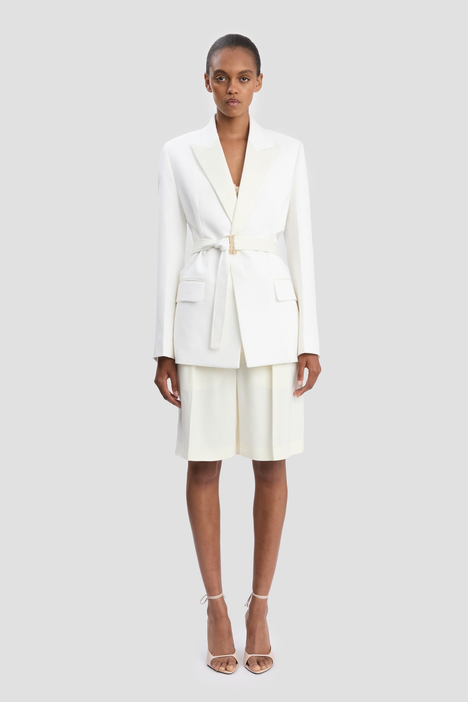 This grain de poudre belted jacket has contrasting satin lapels and buttons for a tactile point of difference. Cut to finish below the hip, it has a B trim belt, front welt pockets with flaps and a single chest welt pocket. Presented in nostalgic Ivory, it has a distinctly feminine sensibility.