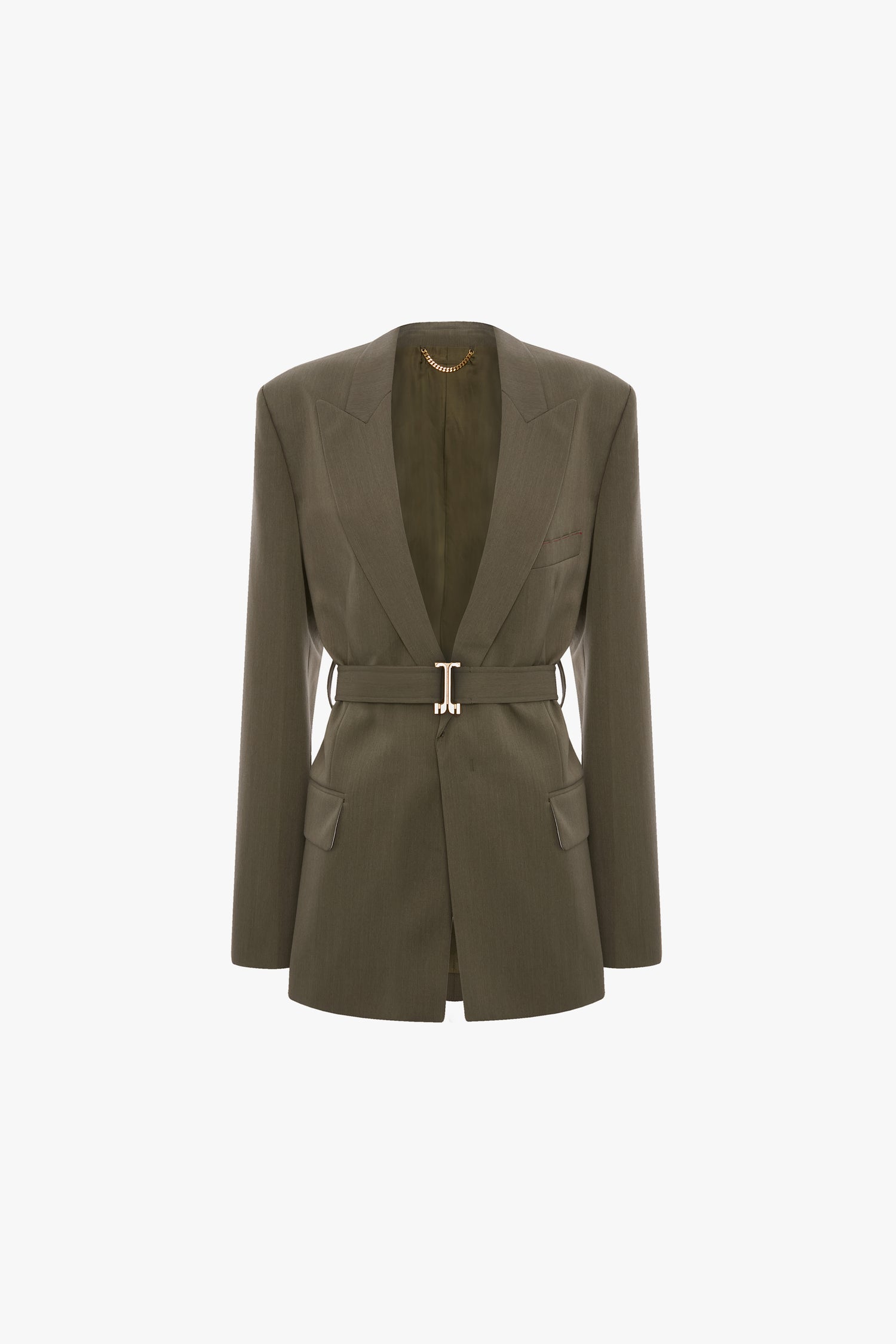 Crisp tailoring is a hallmark of the Victoria Beckham brand and the wool-blend Belted Tailored Jacket in Beige Melange brings a fresh perspective to the house’s edit. Finishing below the hip, it has double back vents, front welt pockets with flaps and a single chest welt pocket. Distinguished by a B belt trim, it exudes modern sophistication.