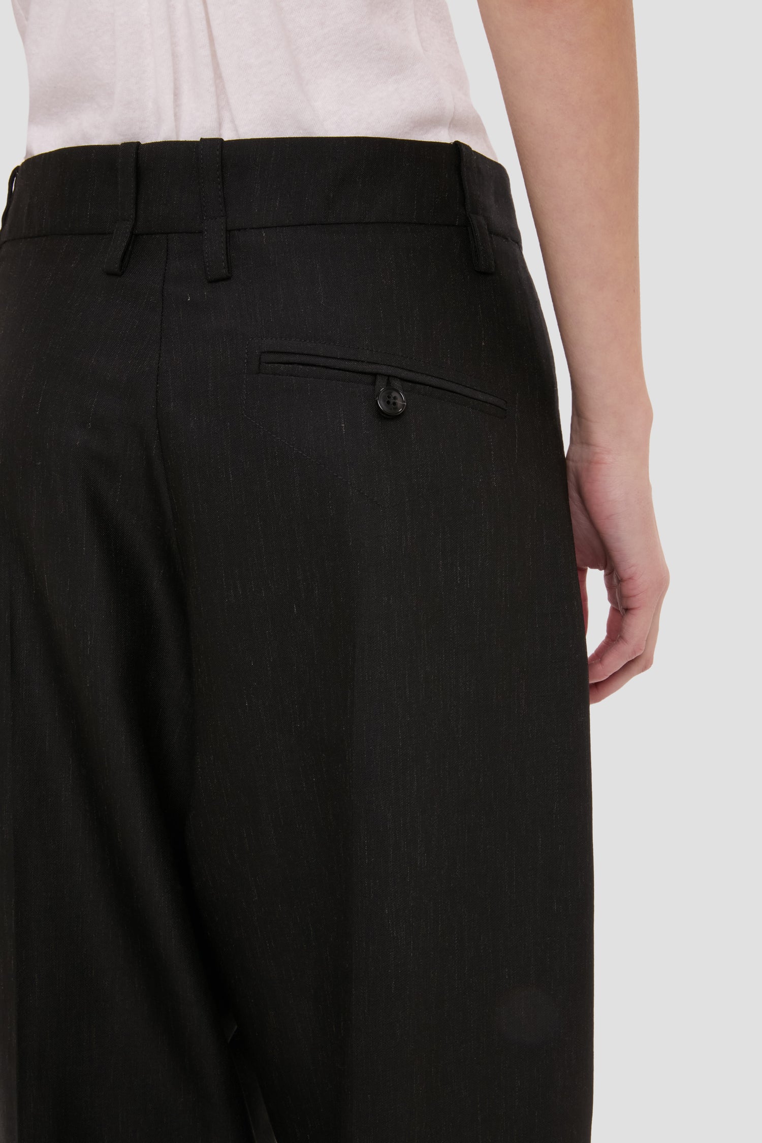 Tailored for a relaxed silhouette, the Curved Leg Trousers are crafted from wool melange with a mid-rise waistline and long-length hemline. A self-fabric waistband elongates the silhouette, while the classic Black colourway has enduring appeal.