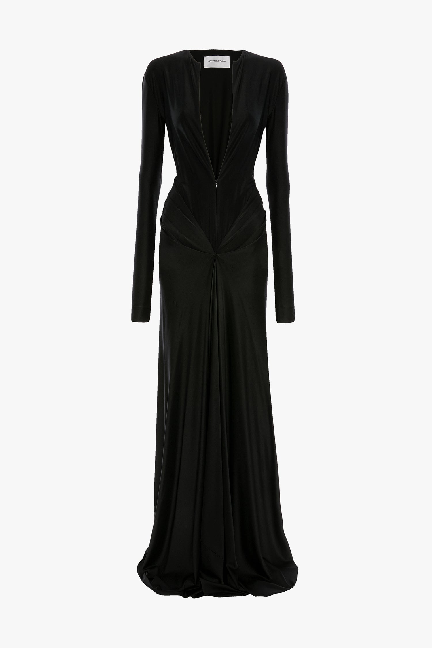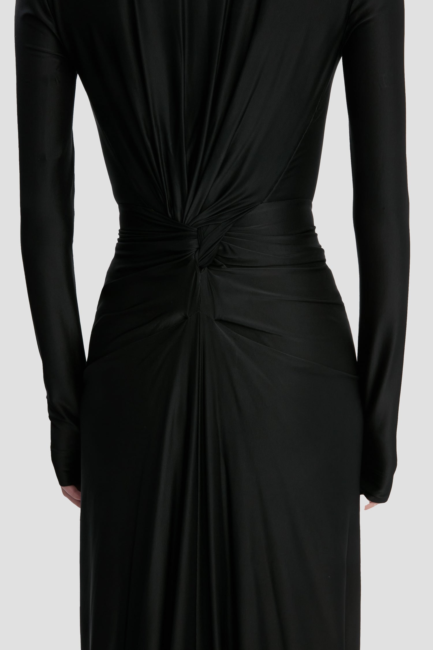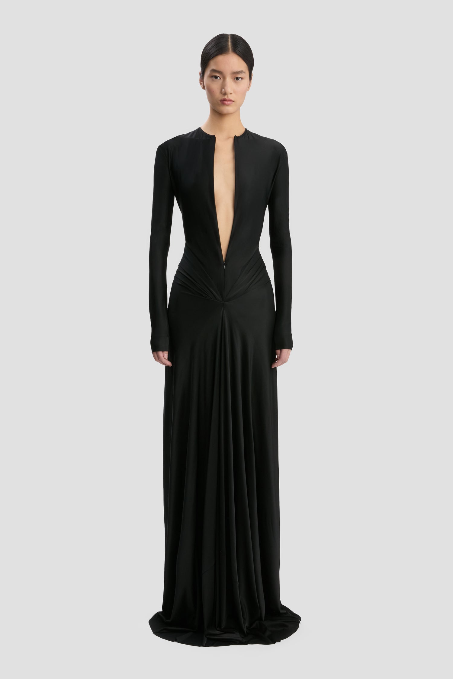 Crafted from a high-shine stretch jersey, the Cut-Out Gown in Black marries sophistication and provocation. Defined by a round neckline, extra-long sleeves and floor-pooling hemline, its modest silhouette is punctuated by a tactile twisted detail with cut-outs at the back bodice.