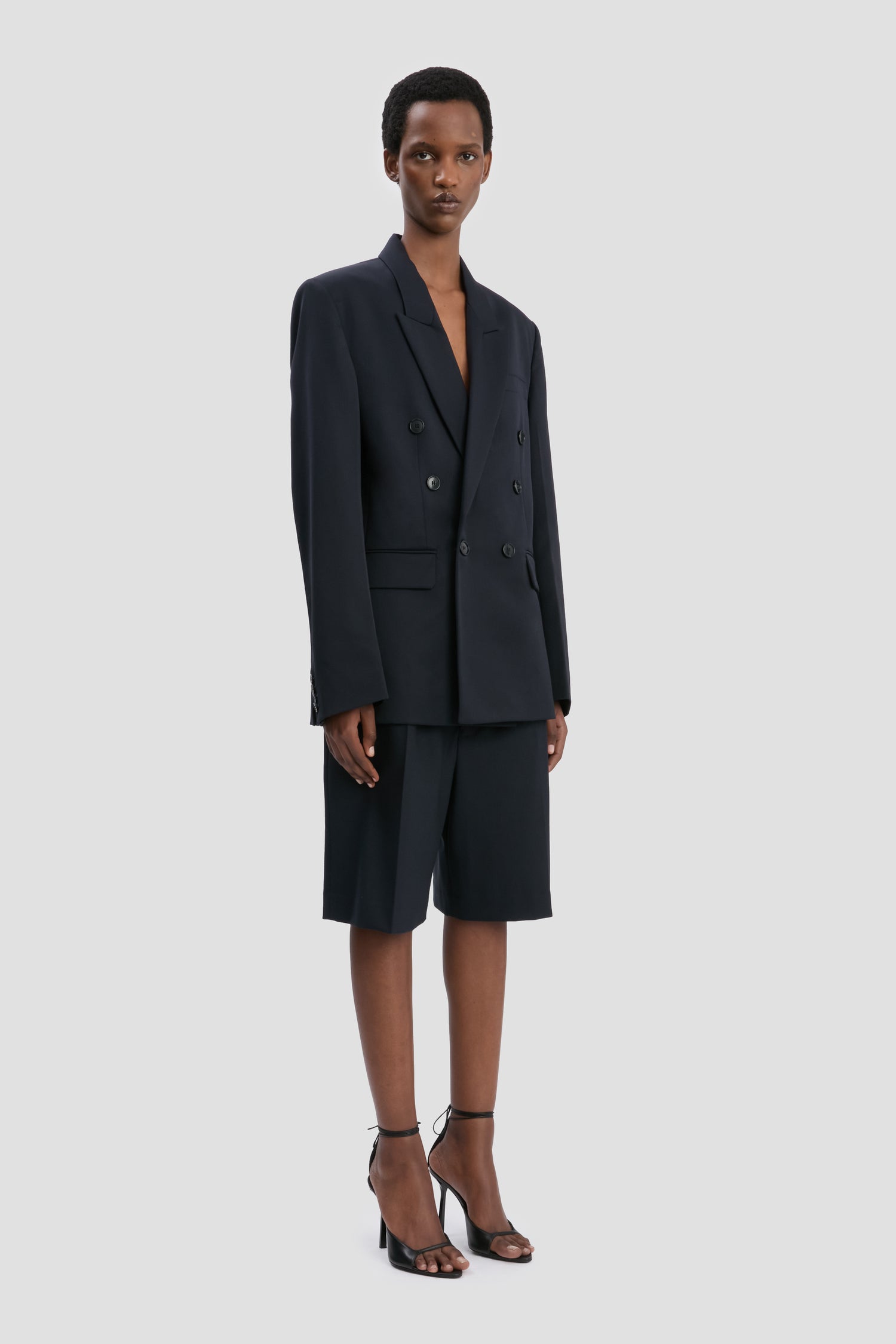 This wool-blend Double Breasted Tailored Jacket in Navy is cut with an oversized fit that finishes below the hip for a modern fluidity. Classic front jet pockets with flaps, a welt chest pocket and back double vents complete the look.