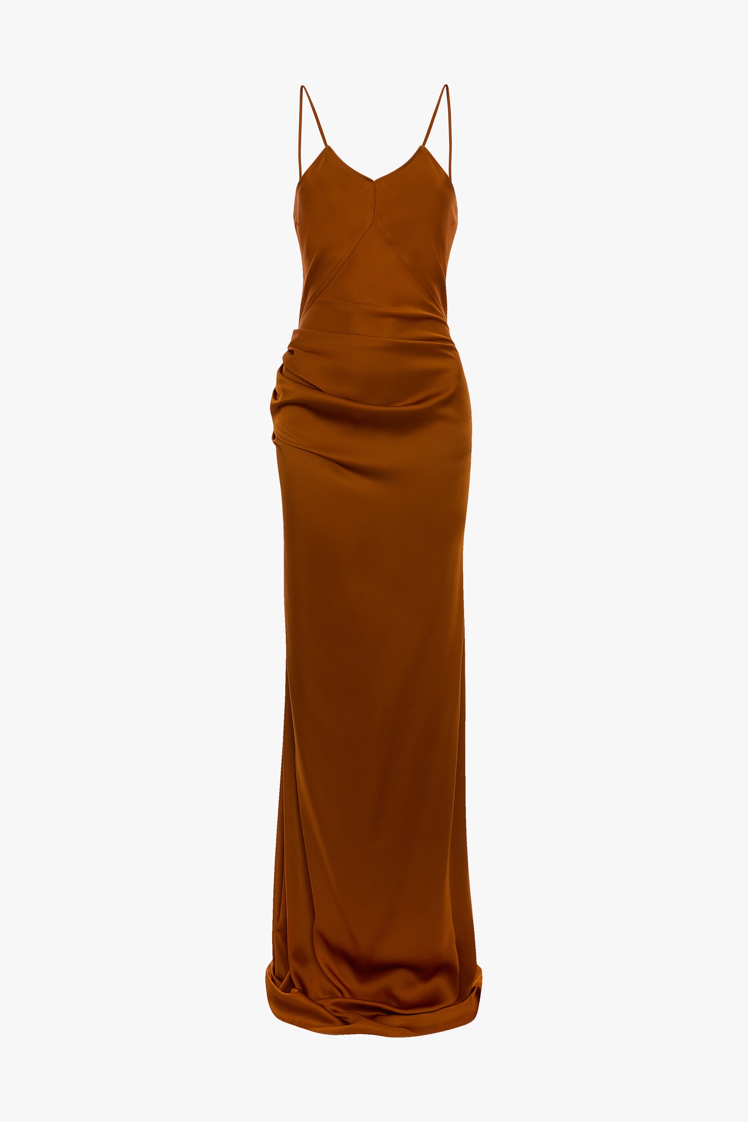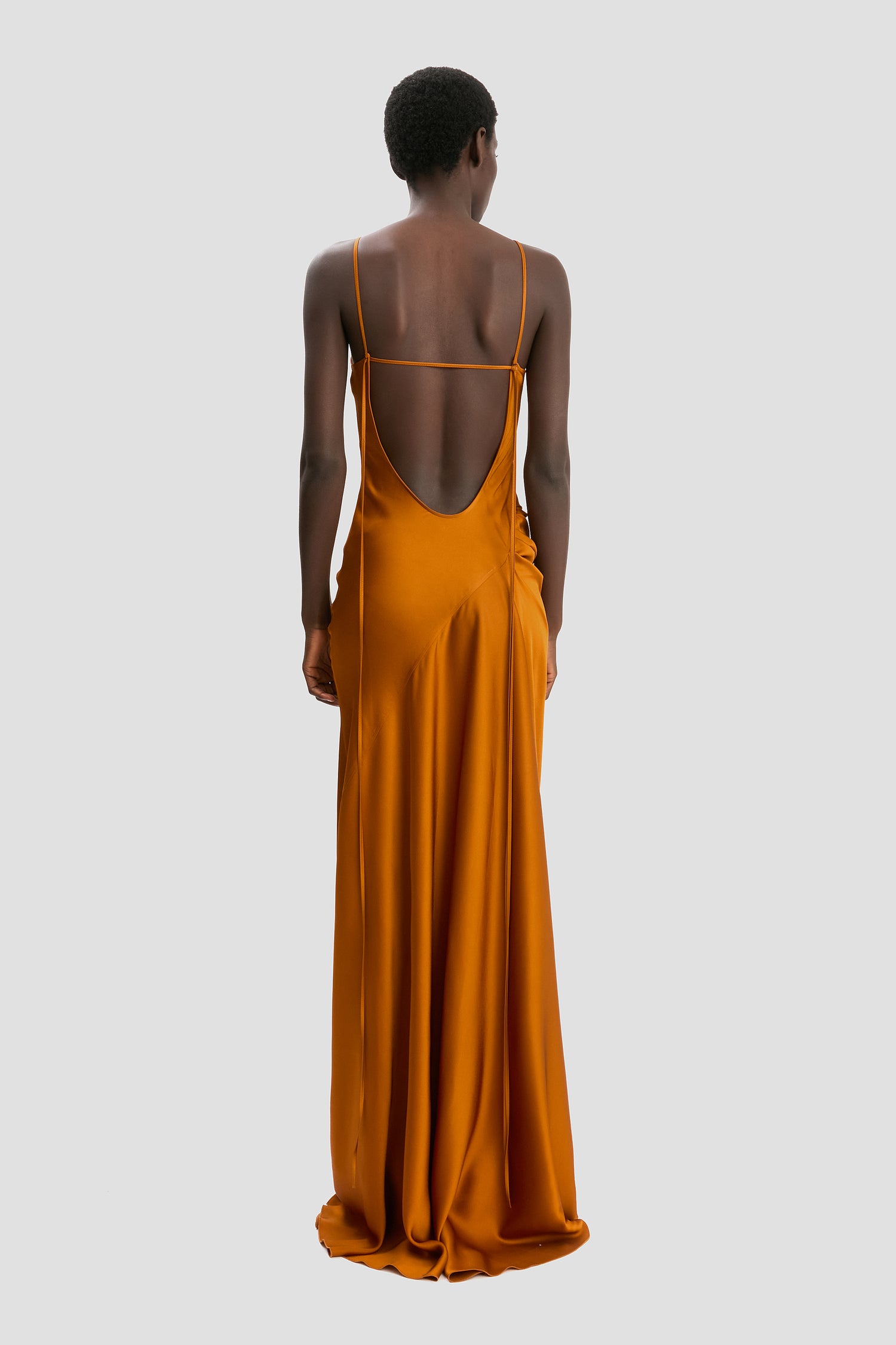 Referencing Victoria’s favourite style decade, this 1990s-inspired camisole-slip dress is crafted from fluid crepe back satin and cut on the bias for a figure-flattering drape. Presented exclusively in Bronze, it has a scooped back neckline and spaghetti straps that extend into ties, which fall elegantly down the back of the dress. Finished with a pleat detail at the hip, it deftly reimagines nineties retro glamour.