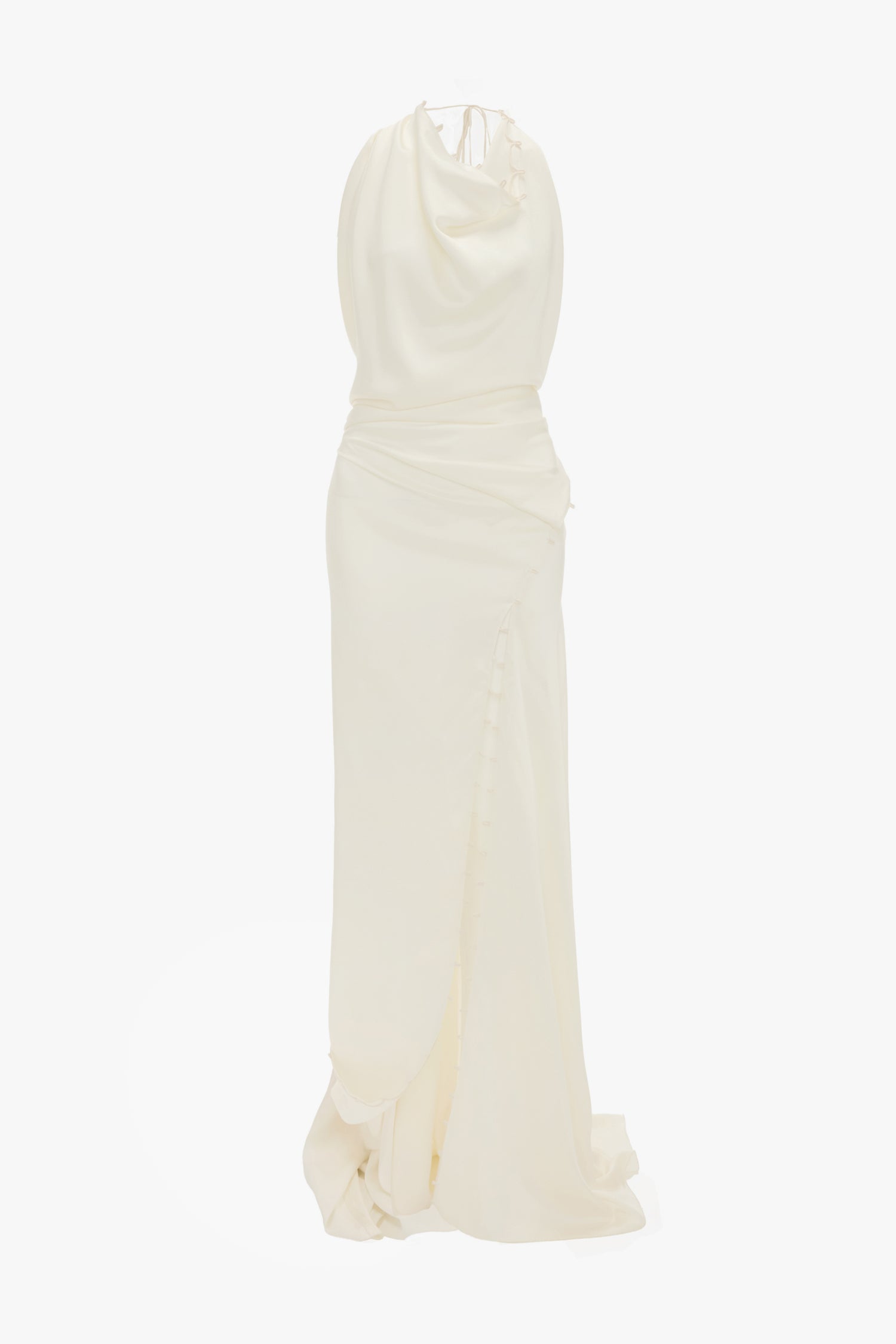 Contemporary evening wear is part of the Victoria Beckham brand DNA and the Draped Gown expresses this signature aesthetic beautifully. Defined by a distinctive draped neckline with rouleaux ties and a draped pleat at the skirt’s side seam, it has a tactility that is sensuous and modern. Crafted from crepe back satin for a figure-flattering fluidity, it has an extended rouleaux trim along the bodice drape and skirt seams and is presented in romantic Ivory.