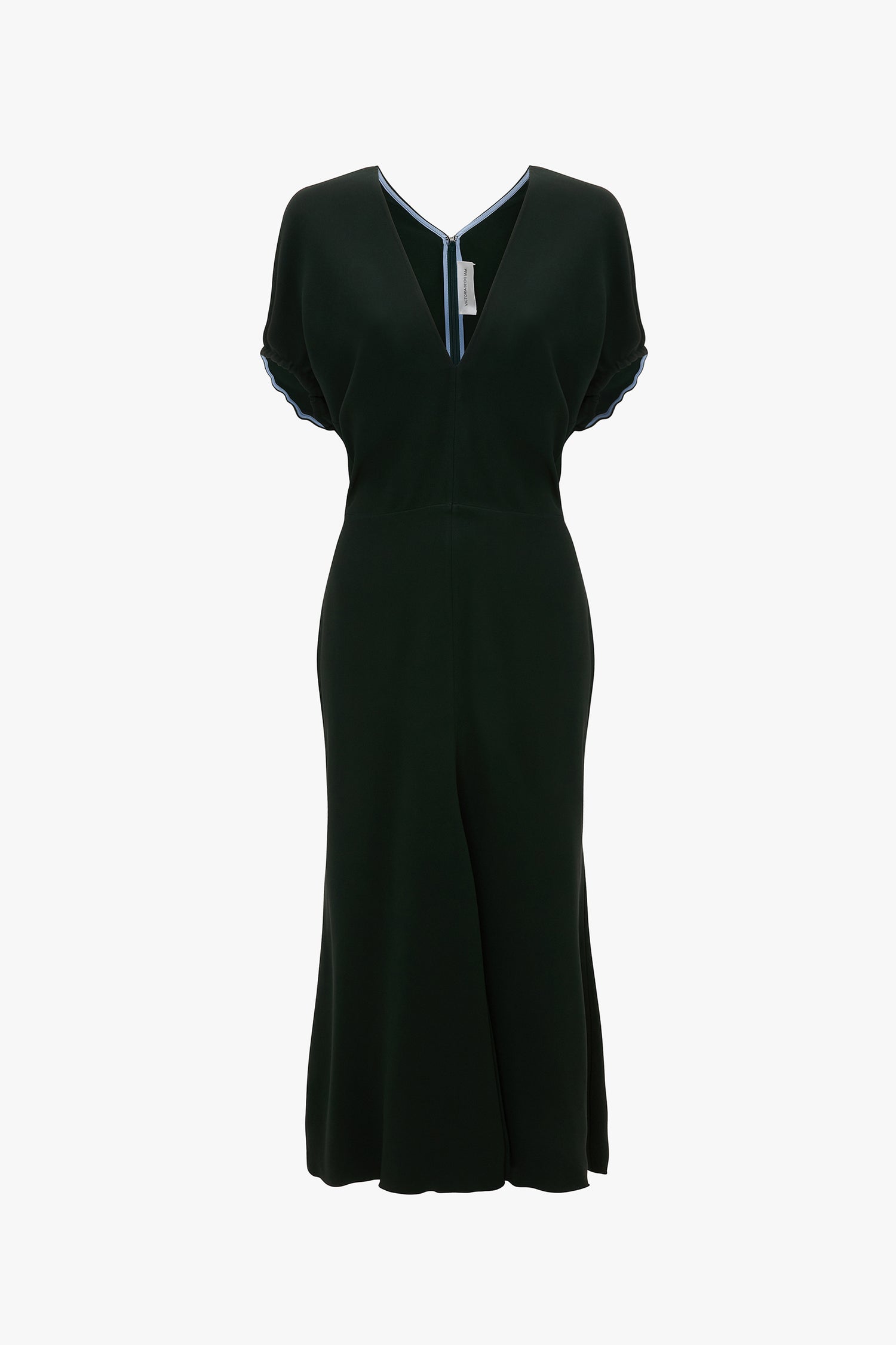 Effortlessly elegant midi dresses are a hallmark of the Victoria Beckham brand. The Edith Midi Dress in sumptuous Dark Pine is characterised by short full sleeves with directional rope edging. A front V neckline with internal binding adds a subtle talking point, while a longer-length hemline at the back adds fluidity to the silhouette. A fitted waist ensures a figure-flattering finish.