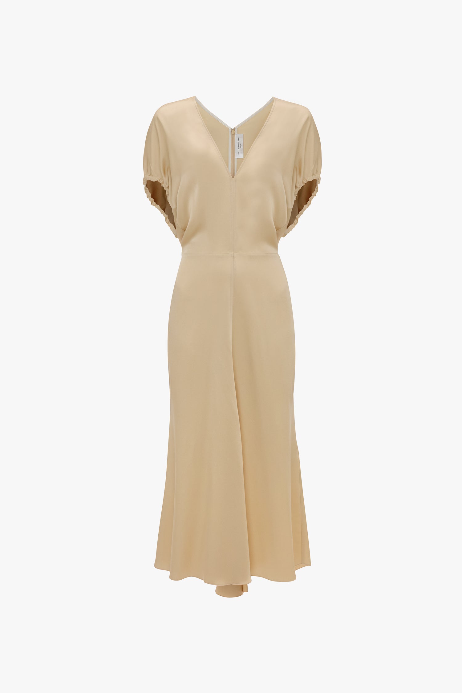Characterised by short full sleeves with directional rope edging, the Edith Midi Dress has a front V neckline and a longer-length hemline at the back. Contrasting internal binding at the neckline adds visual interest, while a fitted waist and fluid skirt ensure a flattering silhouette. Reimagined in Macadamia, it is an effortlessly elegant piece.