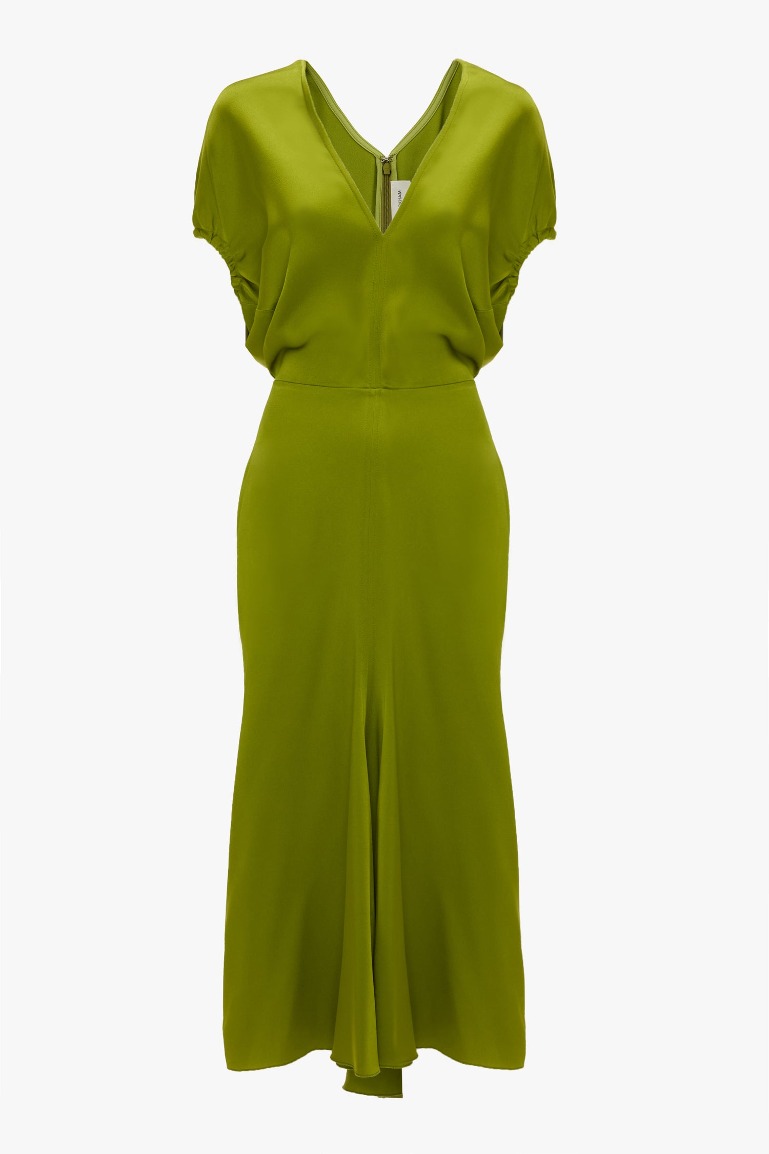 Directional sleeve detailing brings a discreet point of difference to the house’s signature midi dress style. Characterised by short full sleeves with tactile rope edging, the Edith Midi Dress in Parakeet also has a V neckline with internal binding and a longer-length hemline at the back for added fluidity.