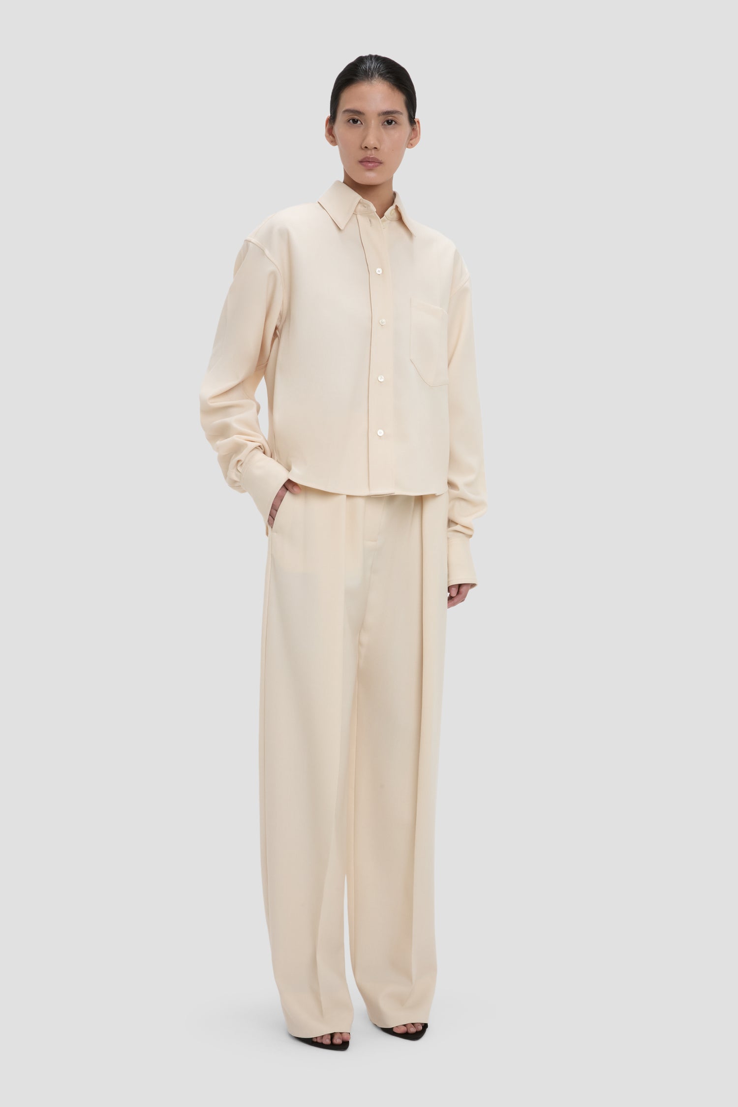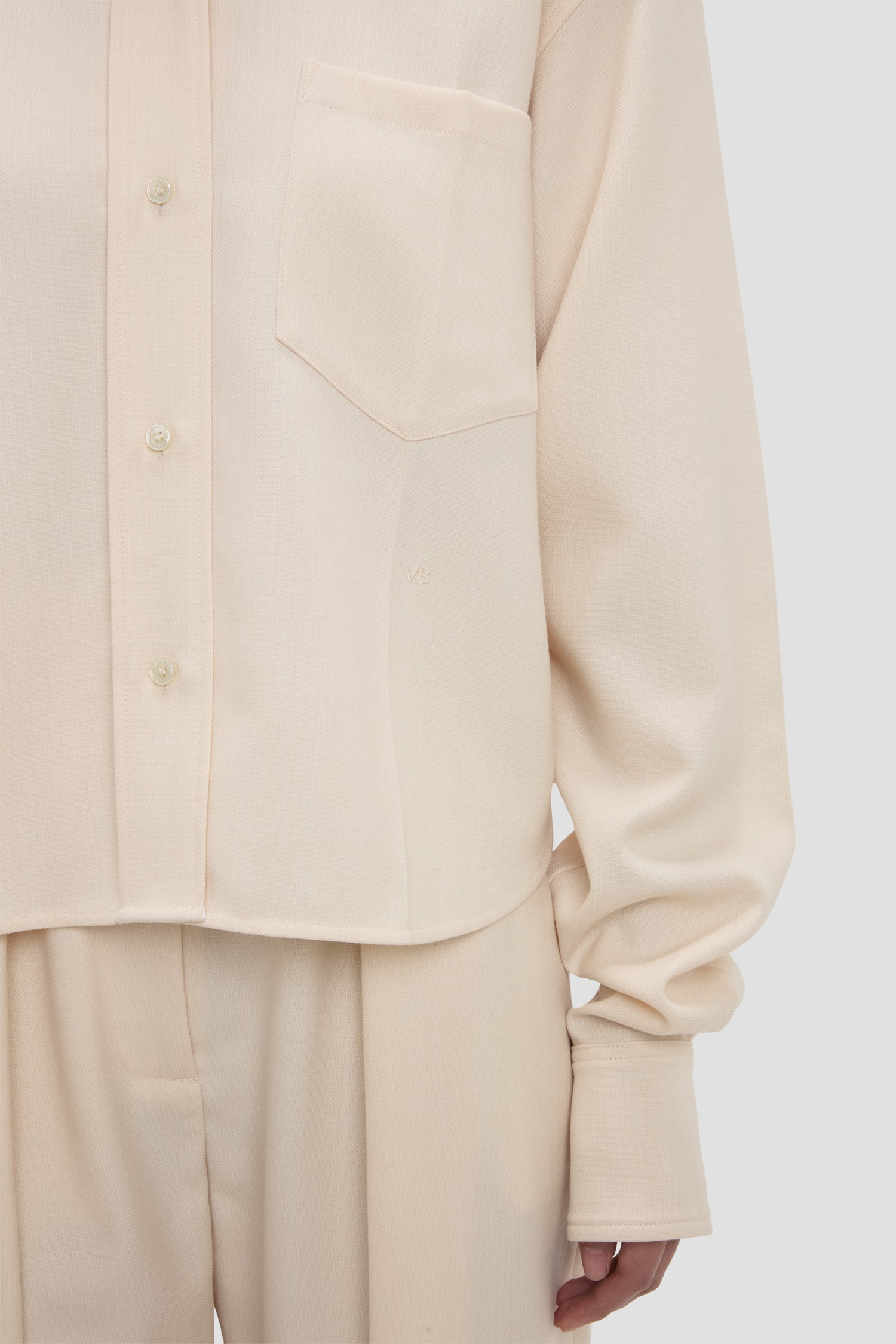 A traditional collared neckline and contrasting cropped hemline give the Ellys Shirt in Alabaster its distinctive appeal. Front buttons and a chest pocket reflect classic shirting design codes, while embroidered detailing adds the house’s signature finesse.