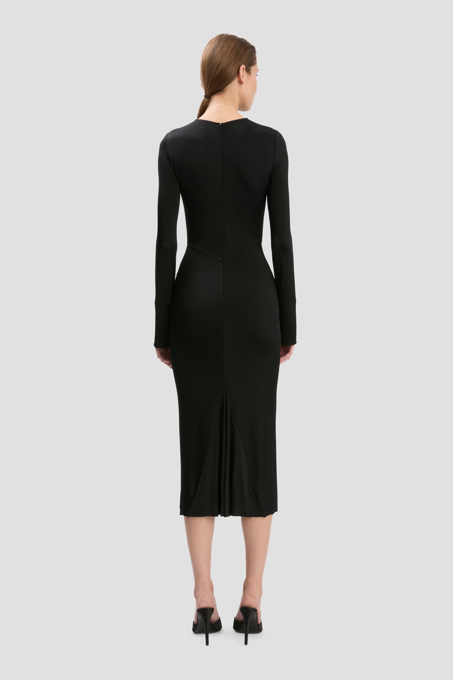 The modest and minimalist design of the Frances Midi Dress creates a contemporary and confident silhouette. Crafted from stretch jersey with a high shine, it is fitted through the body and sleeve with a godet insert at the back of the skirt for a feminine flare. A circular gathered detail at the front of the skirt creates a flattering focal point, bringing texture and visual interest to the understated aesthetic.