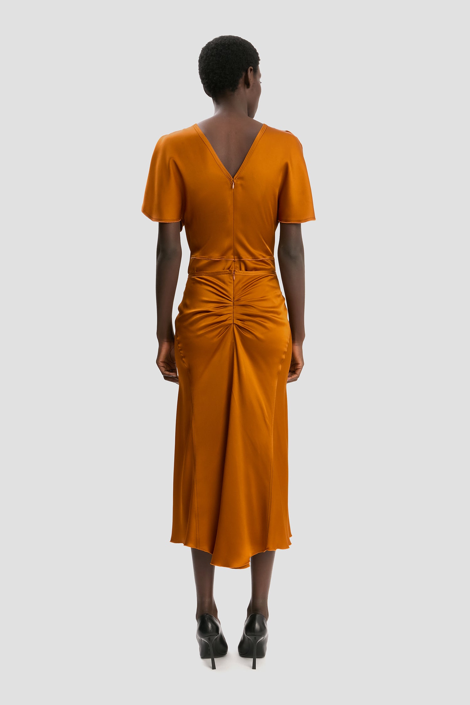 Crafted from crepe back satin for an elegant drape, it is fitted at the hips with a flared skirt and has front and back pleat details. Side seams with a contrasting topstitch bring an elevated finishing touch.