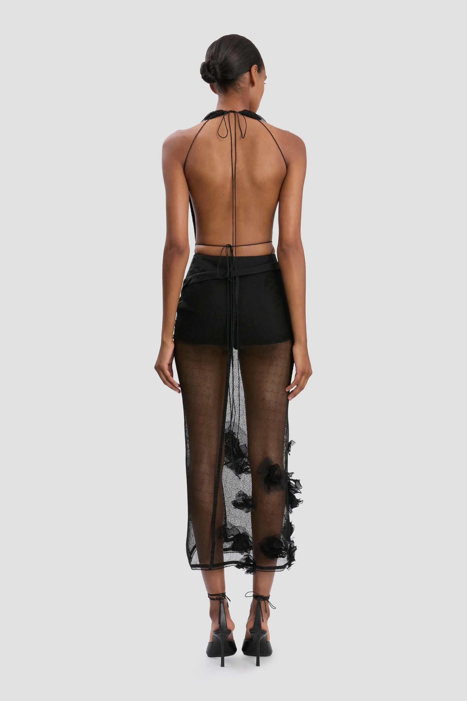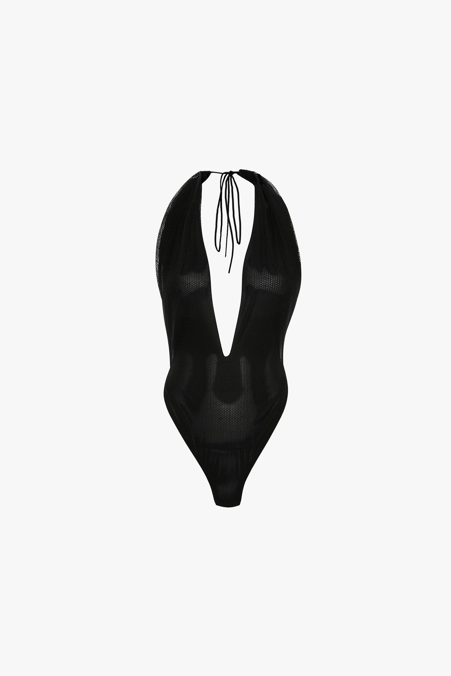 Sophisticated and sexy, the Halter Neck Lace Bodysuit in Black is delicately crafted from an irregular stretch mesh and lined in lightweight jersey. Defined by a front plunge neckline with tie fastening at the neck and gathered detail at the shoulders, it has a high-leg cut and an adjustable ruched pant with gusset.