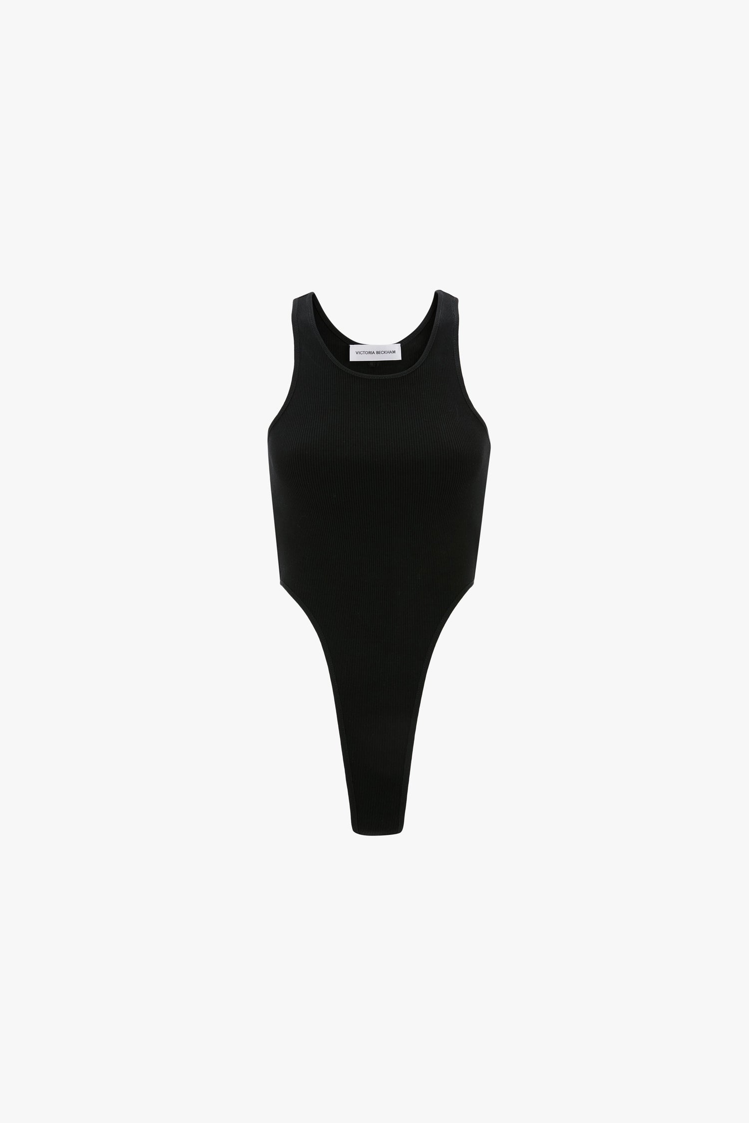 Playful and provocative, the High Leg Bodysuit in Black has a dramatic high-cut leg, scoop neckline and racerback finish. Crafted from a compact ribbed jersey for a body-hugging silhouette, it has adjustable clasp closures for comfort and a tonal Victoria Beckham logo at the back of the neck.