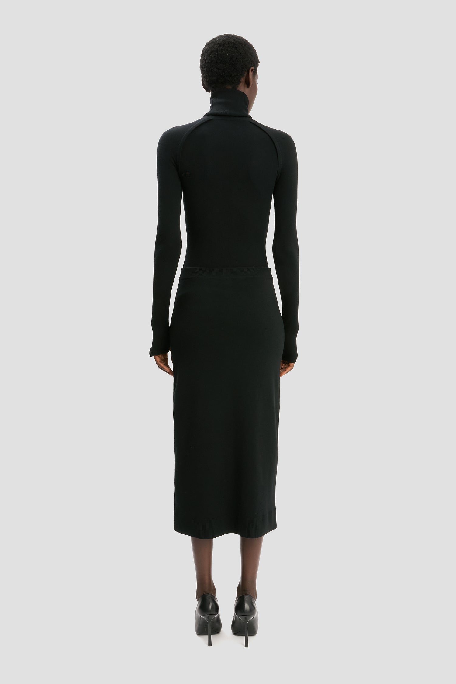 Crafted from 100% merino wool, the High Neck Jumper has a slim cut and a centre front-button placket. A ribbed stretch waistband and ribbed knit hemline enhance the silhouette, while knit-covered buttons keep the look understated yet elevated. Presented in classic Black, it is a sophisticated wardrobe basic.
