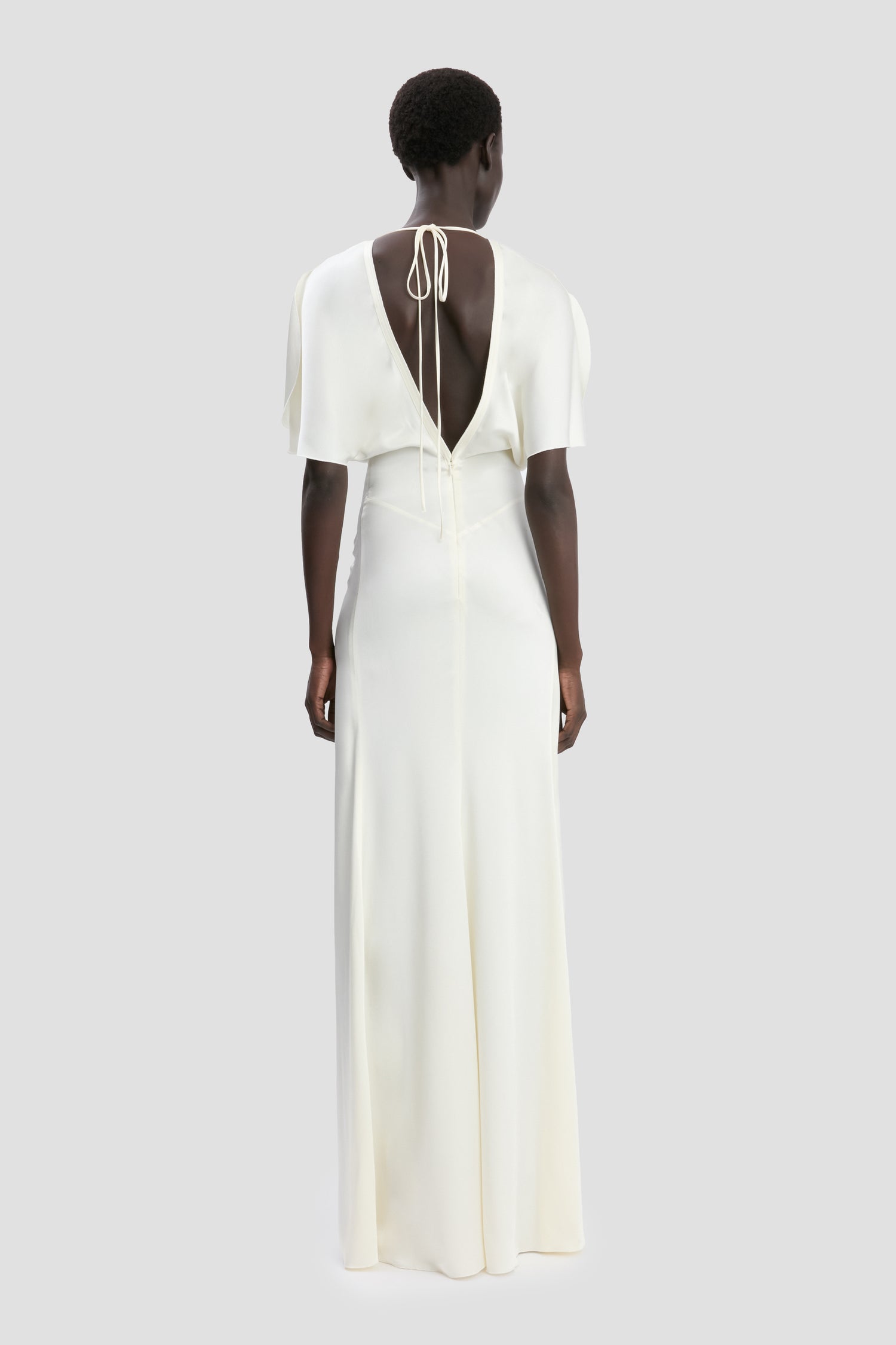 Reimagined in a nostalgic shade of Ivory for SS25, the Isabella Dress is a romantic proposition for the new season. Crafted from luxurious crepe back satin, it is fitted at the waist and hip for a flattering hourglass shape. A provocative open back design, elegant tie detail at the back of the neck and tactile pleating at the skirt add sensuous points of difference. A floor-pooling hemline adds a dramatic finishing touch.