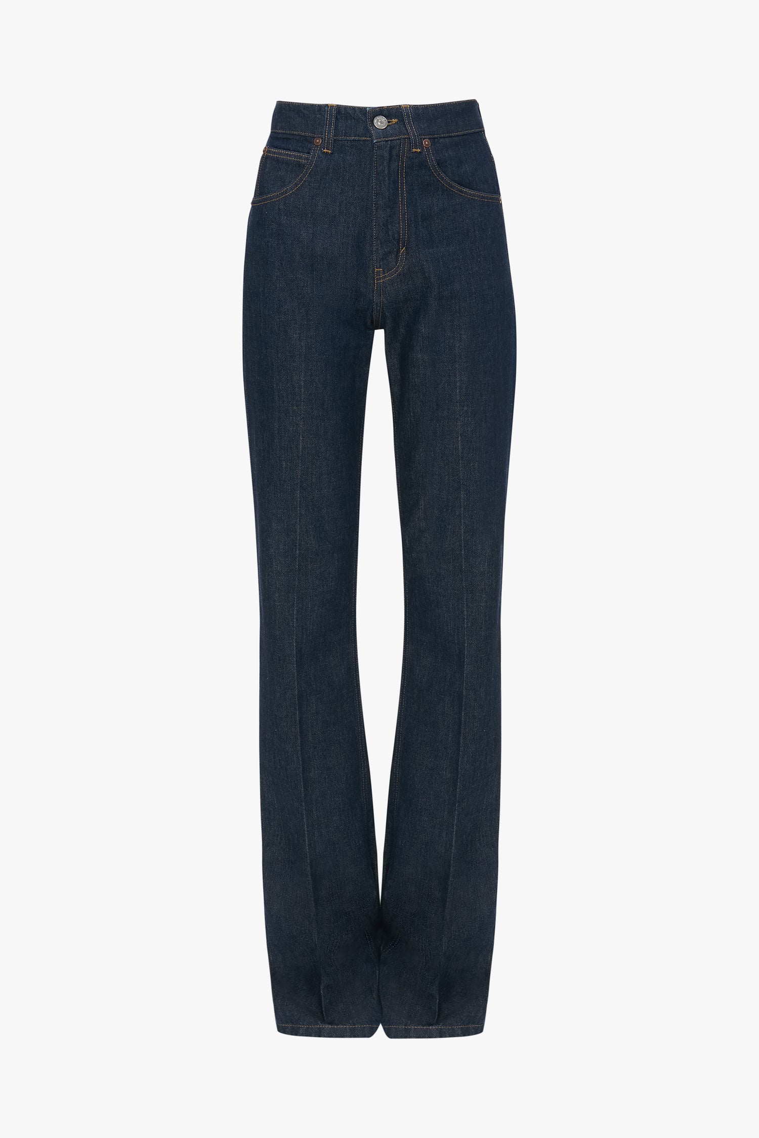 • Indigo denim, high rise, straight leg jean