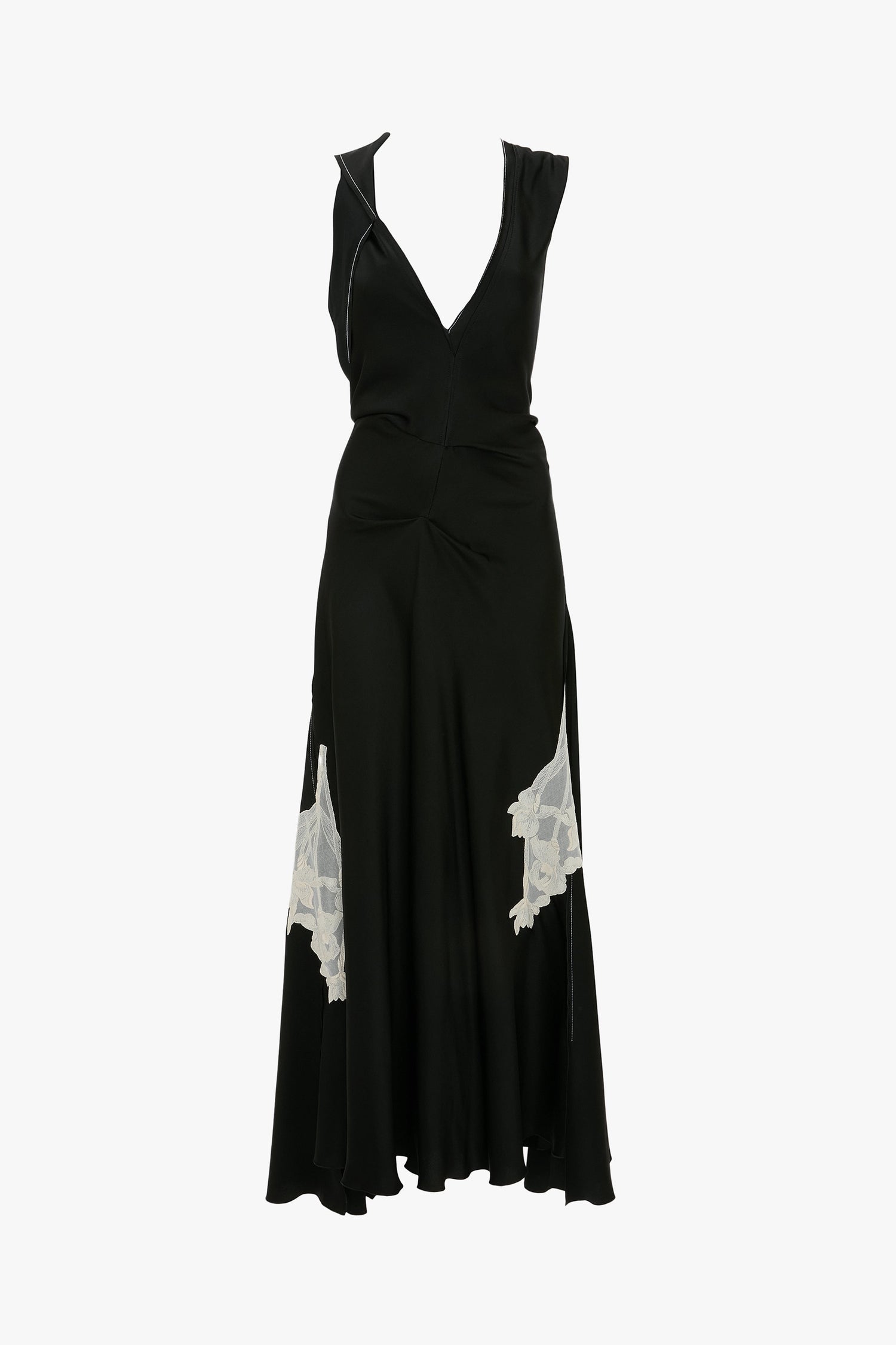 Crafted from crepe back satin for an elegant fluidity, the Draped Lace Detail Midi Dress is both sentimental and seductive. A deep V neckline and raised hemline at the front add provocative talking points while the contrasting lace appliqué on the front skirt brings a romantic sensibility. Exposed seams and a contrasting topstitch complete the look.