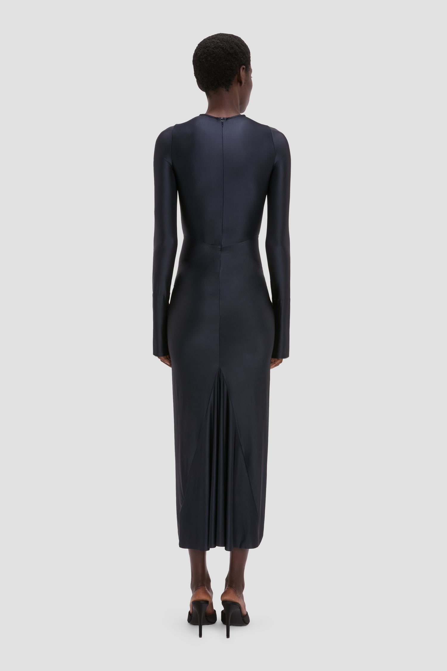 The Frances Midi Dress in Navy is crafted from heavy shine jersey for a body-sculpting silhouette. A front round neckline, long sleeves and a midi-length hemline look modest and refined, while a front gathered detail adds a sensuous point of difference.