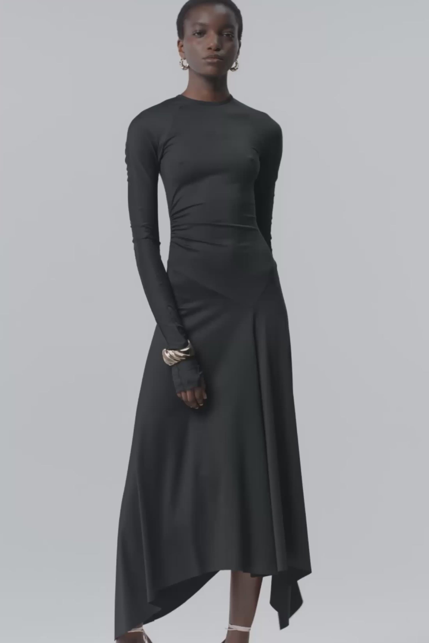 An understated but distinctive piece, the Midi Dress in classic Black has a modest round neckline, long sleeves with thumb hole and concealed zip at the front. Elevated with tactile ruching and a playful asymmetric hemline, it has wear-anywhere appeal.