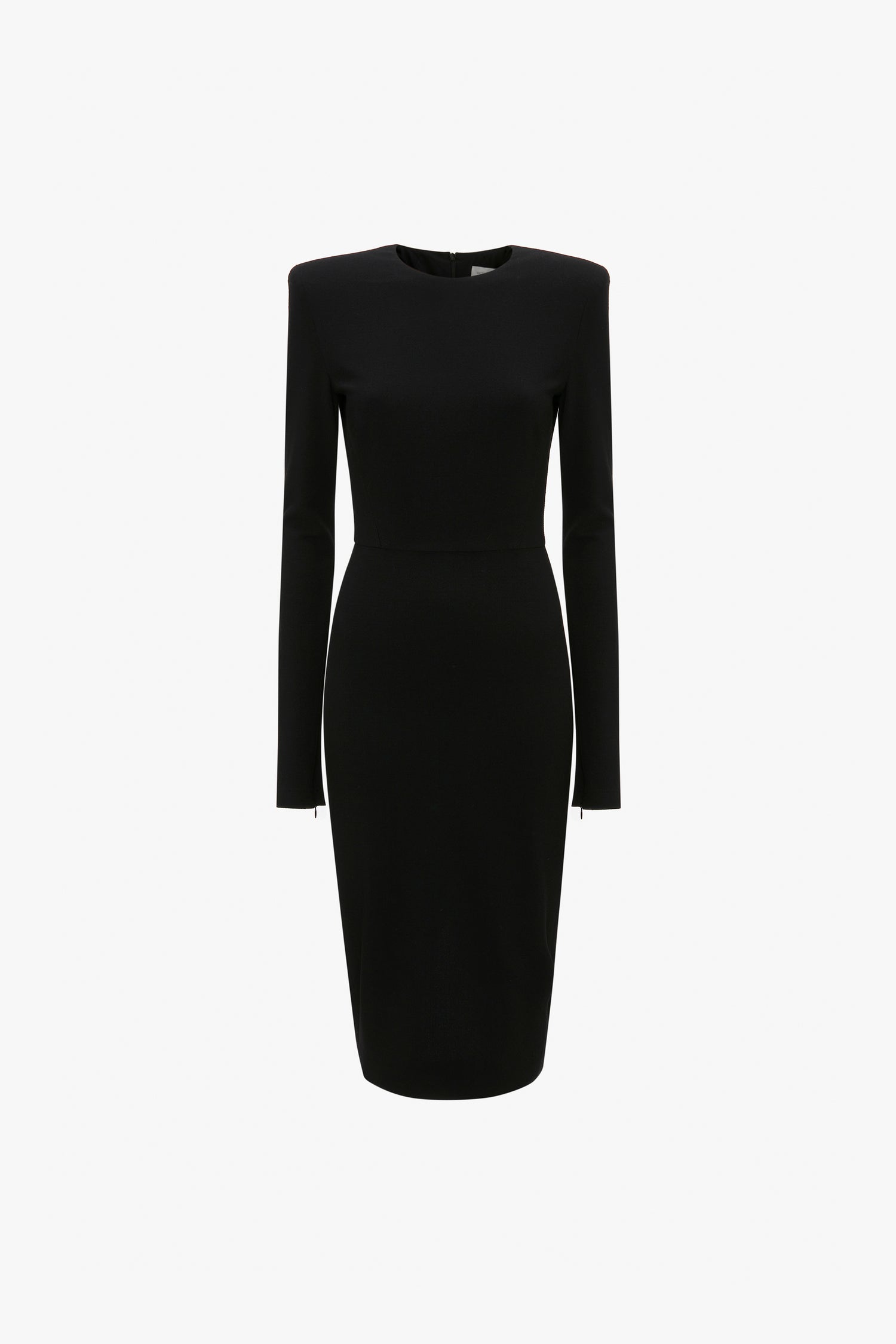 The signature Victoria Beckham T-shirt Dress is reinvented for the new season with long, fitted sleeves and structured, padded shoulders. Crafted from a bi-stretch crepe for a body-skimming silhouette, and with a modest round neckline and below-the-knee hemline, this dress is both provocative and polished. Style simply with the Squared Toe Platform Sandal and a Classic Chain Pouch.