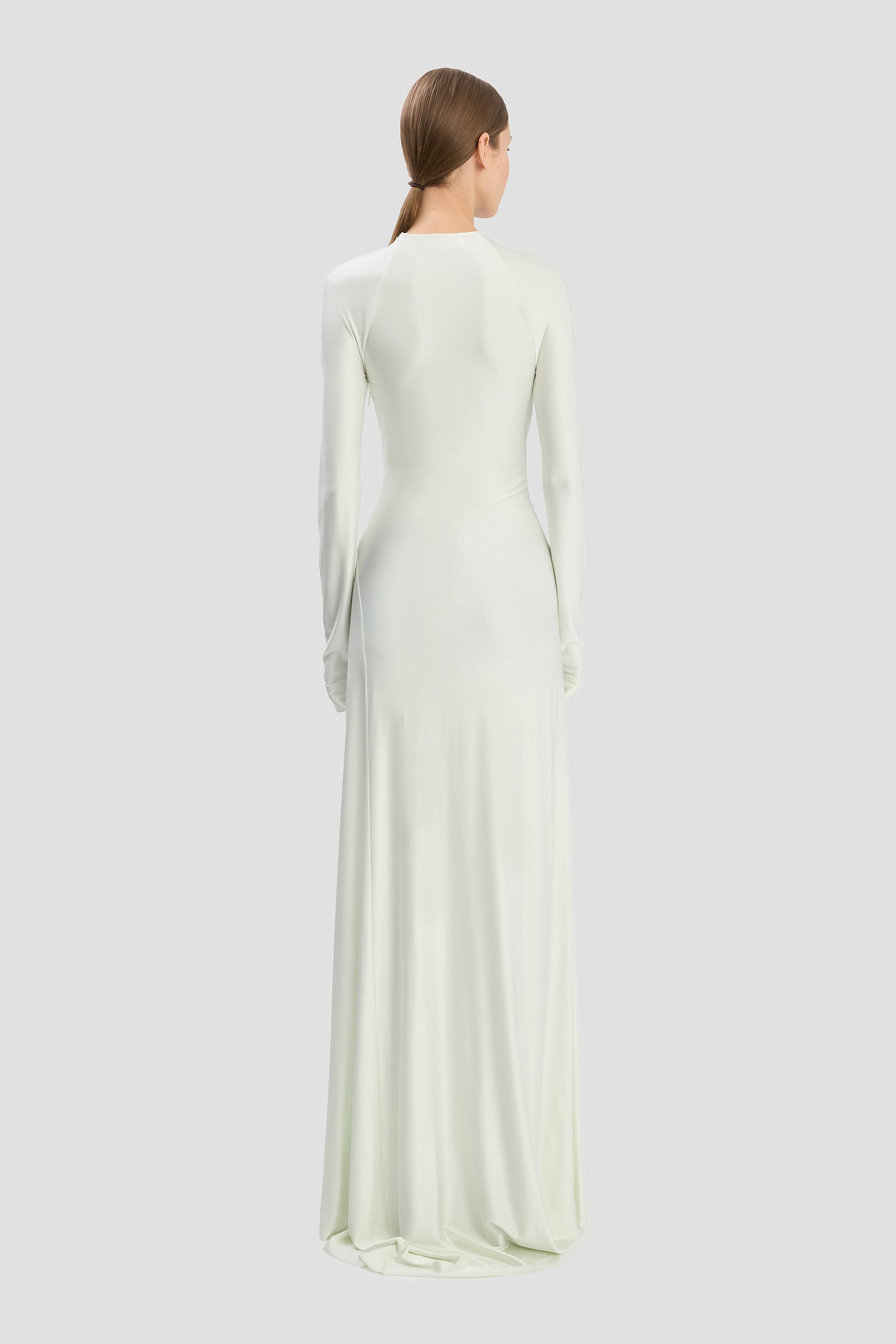 The Twist Gown’s modest silhouette is imbued with theatrical flair by virtue of a floor-pooling hemline and sensuous knotted detail at the front waist. Crafted from a body-sculpting high-shine jersey in romantic Ivory, it has a side-seam split and longer-length sleeves with tactile ruching at the cuff.
