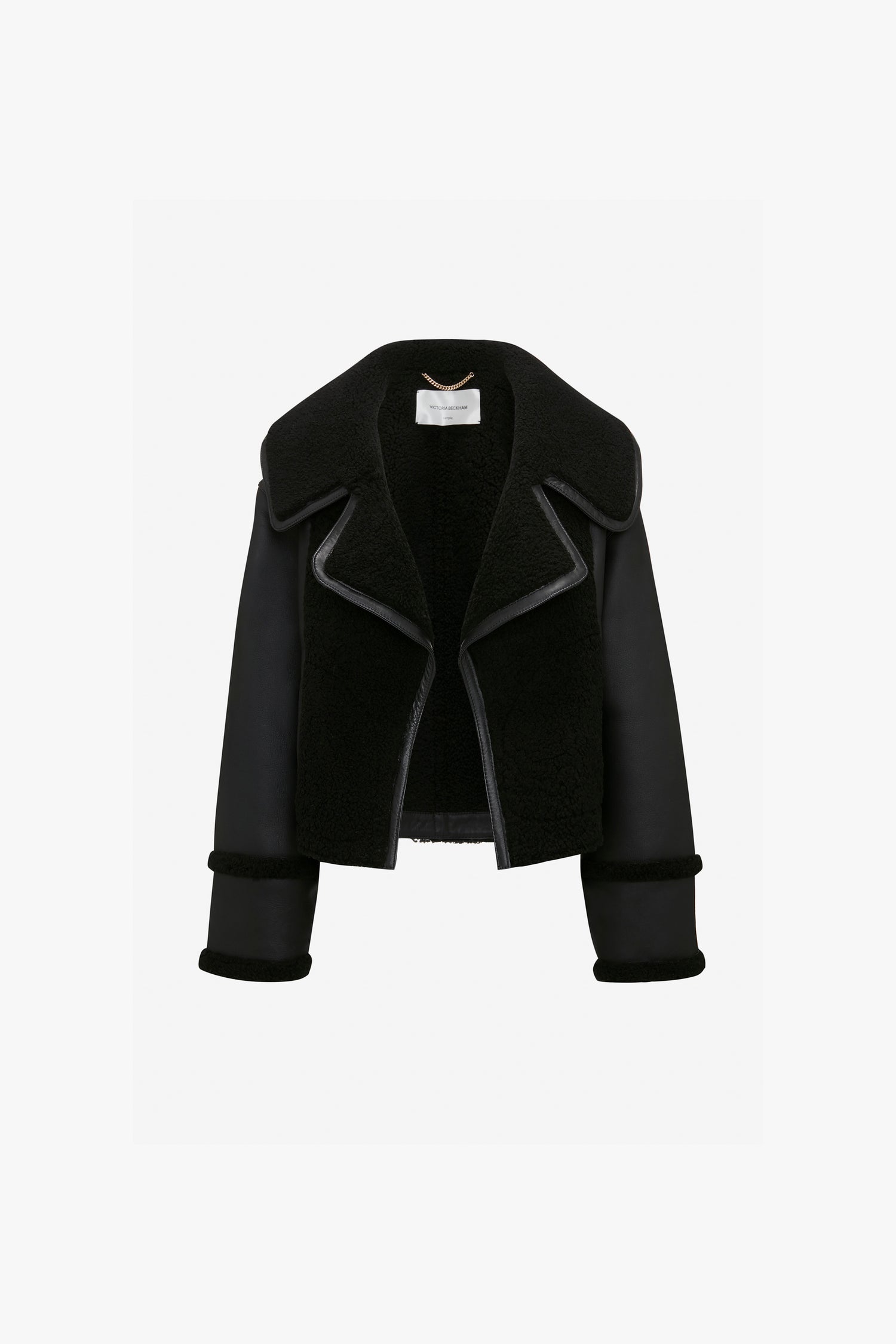 A cropped silhouette, extra-wide collar and luxurious shearling fabrication elevate the traditional aviator-style jacket into a modern classic. Practical but polished, it has centre front snap fasteners and sophisticated twin topstitch detailing. Presented in classic Black, it will bring a utilitarian edge to smart tailoring of feminine separates.
