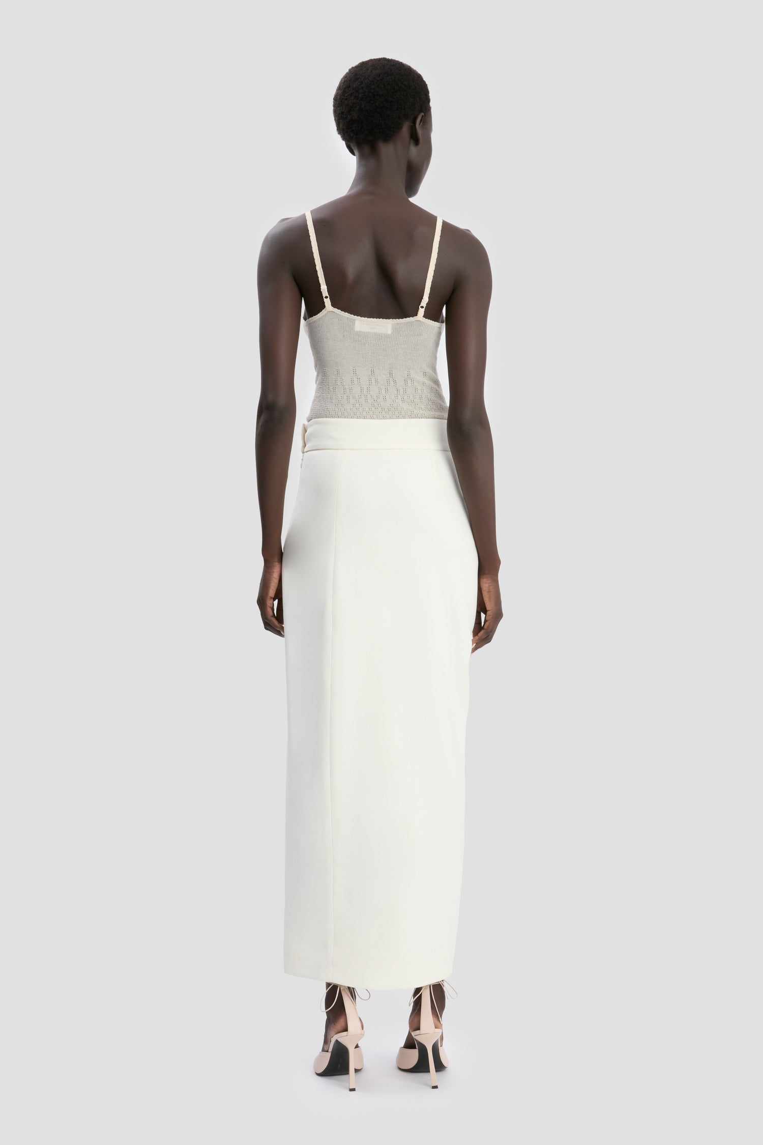 A tactile twill fabric and thigh-high split bring a sensuous undertone to the Split Detail Skirt. Fully lined with front and back dart detailing, it is presented in romantic Ivory for a feminine counterpoint to the sexy silhouette.