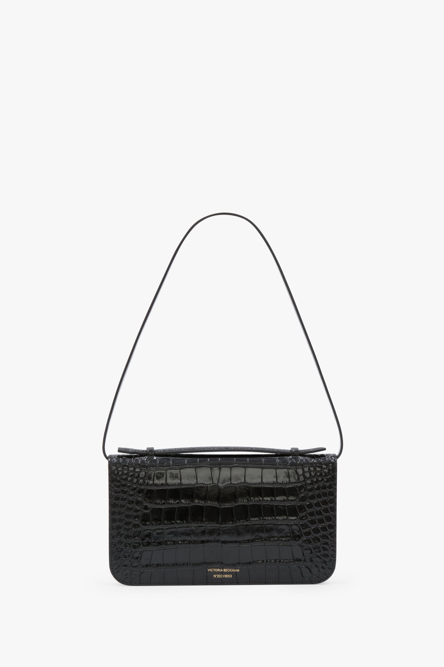 New to the Victoria Beckham leather goods edit, the Dorian Pochette is a polished evening wear handbag with a structured top handle and a removable strap. Made in Italy from croc-embossed calf leather and microsuede lining, it has the house’s signature B Frame, split-lock hardware and an internal double compartment with flat pocket. Presented in classic Black, it has an understated elegance.