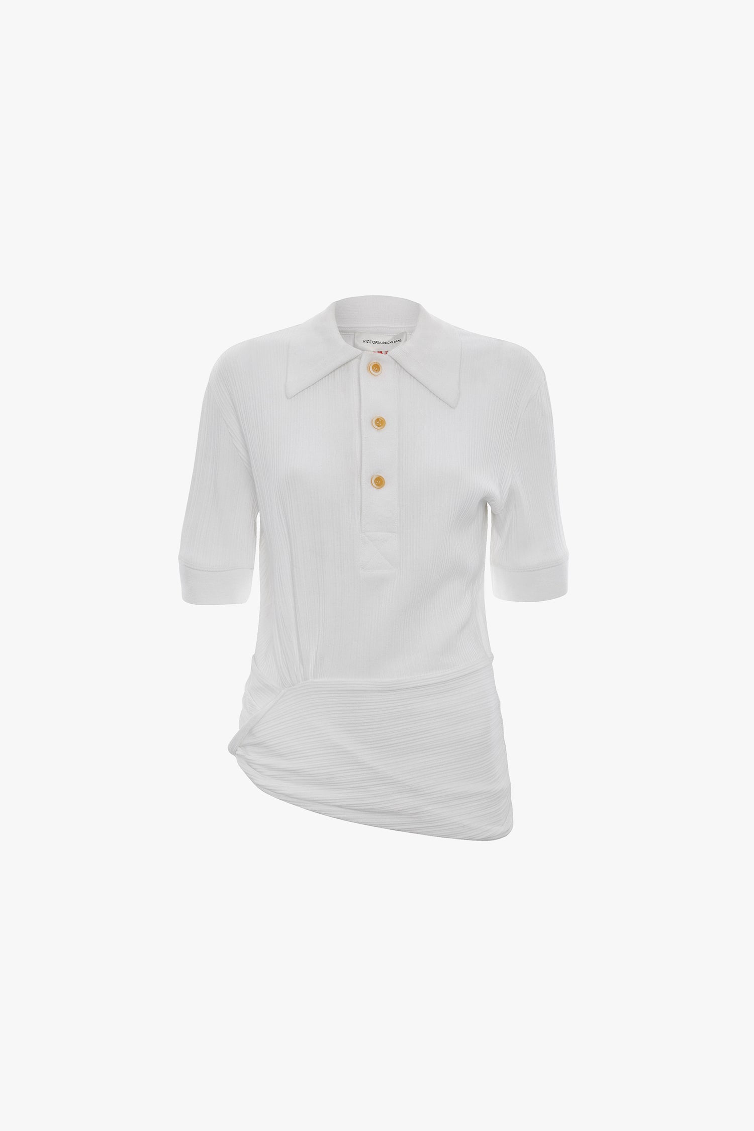 The classic polo top is reimagined with a tactile twist detail and asymmetric cut at the hemline. Crafted from organic ribbed cotton, the Twist Detail Polo Top in White has a traditional polo collar with buttons and is finished with an embroidered Victoria Beckham monogram at the centre back neckline.