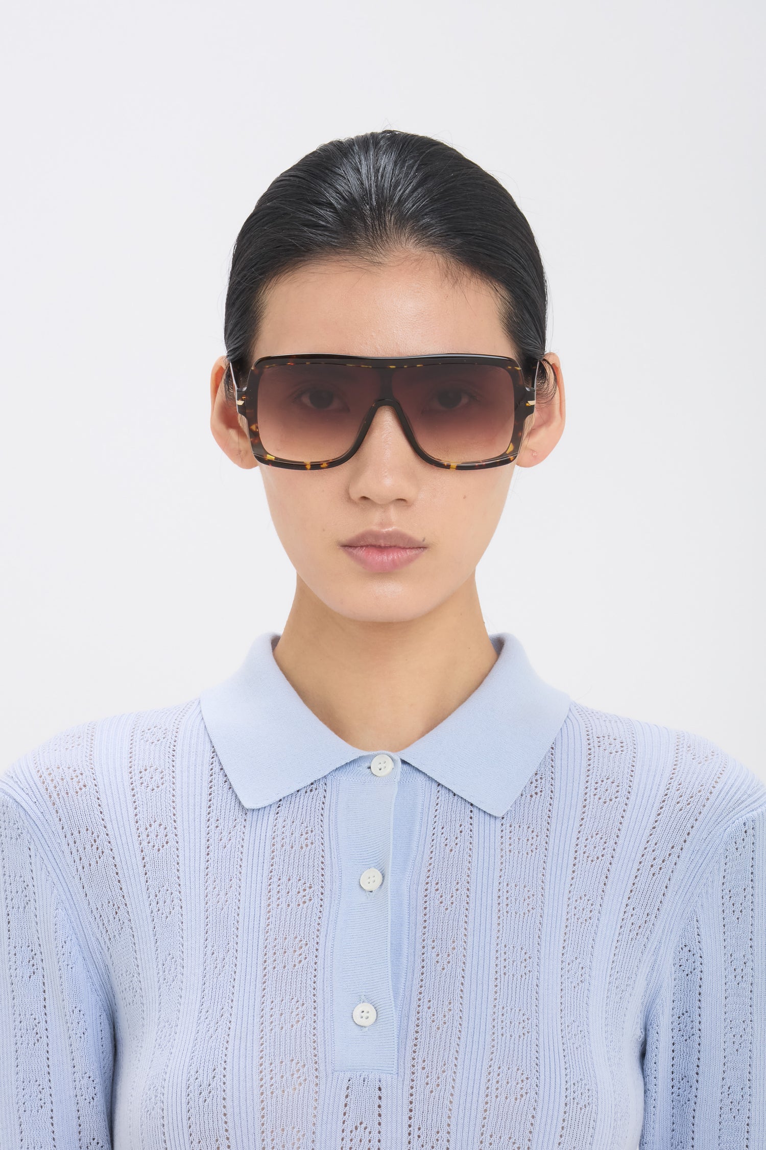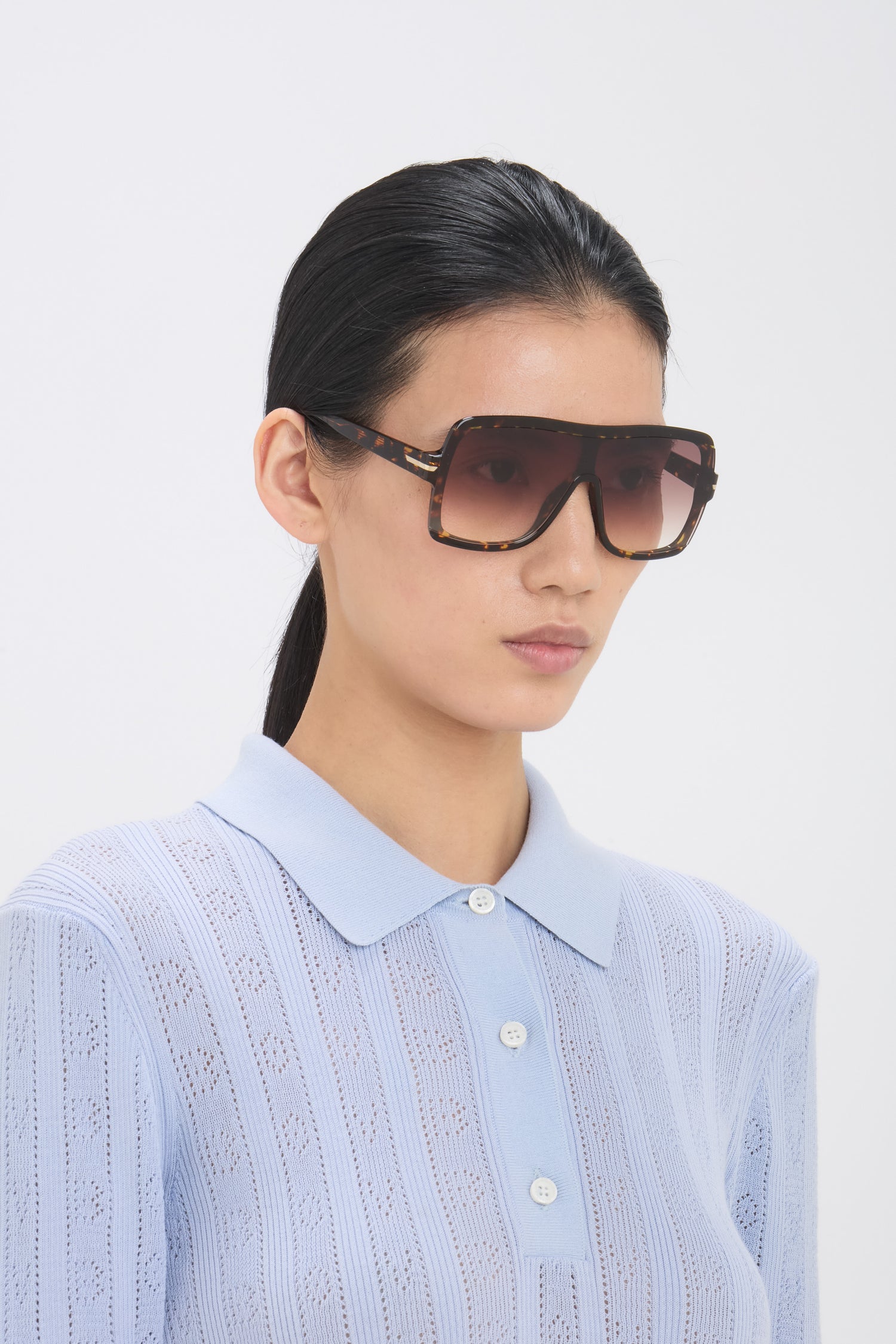 Defined by their squared flat mask, these sunglasses are crafted in acetate and presented in the attractive colourway, Havana, with contrasting brown shaded lenses. They are embellished with the house’s signature V-cut logo.