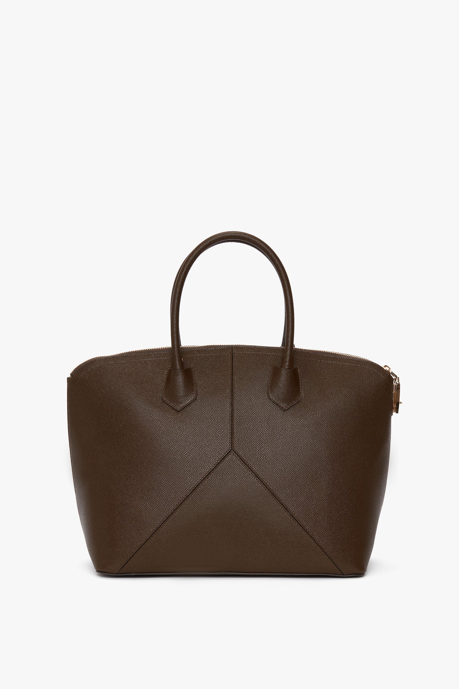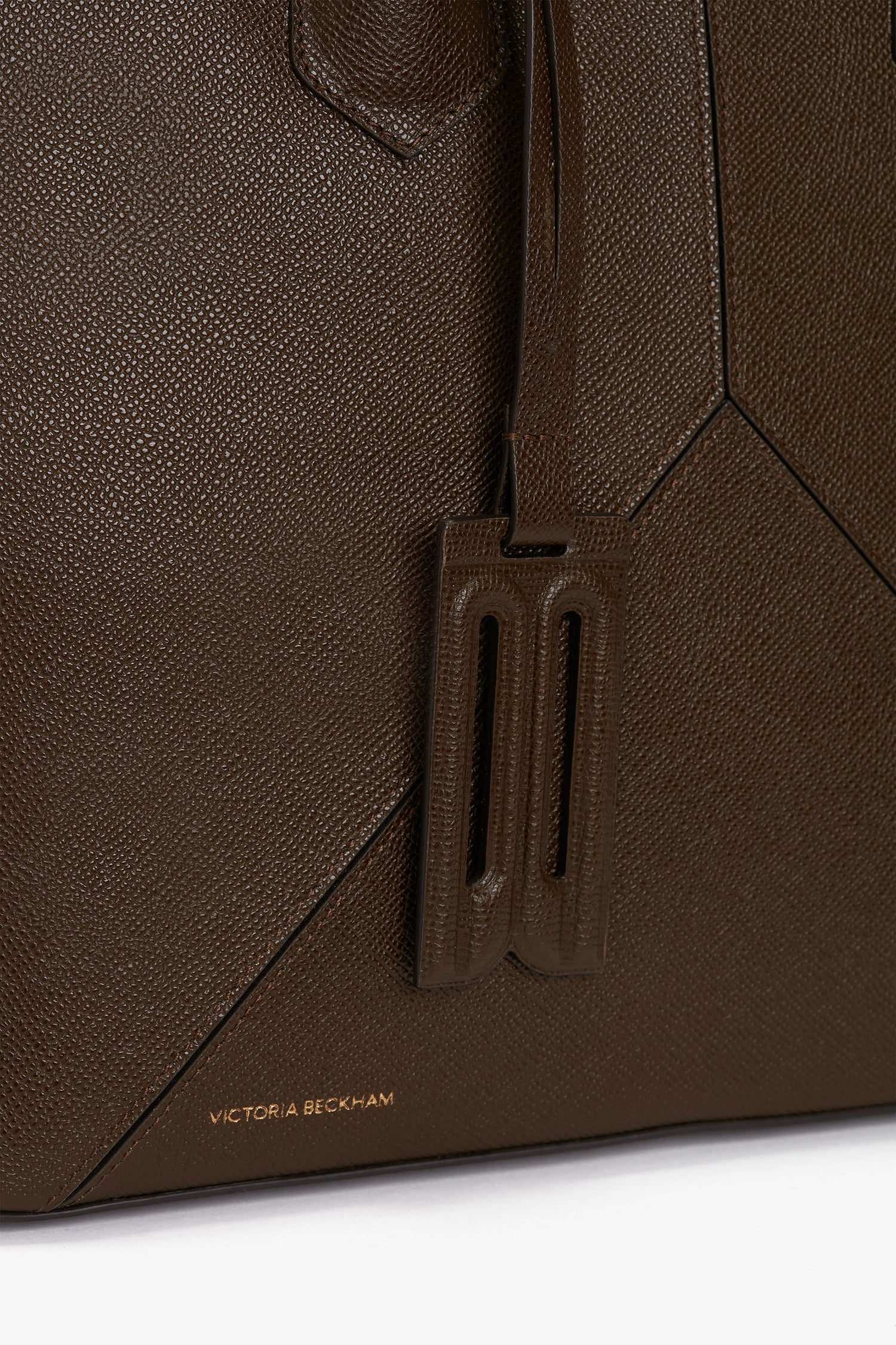 Refined and versatile, The Victoria Bag in Khaki, crafted in Italy from a textured calf leather, embodies the house’s penchant for practical but polished accessories. A removable ‘smart strap’ with snap buttons allows the bag to be worn as a shoulder or crossbody, while top handles and a generous volume ensure absolute convenience. The house’s signature design feature of leather panels stitched to form a V shape adds visual interest, while the discretely stamped address of Victoria’s London studio (N.202) followed by a unique serial number elevates the look further. Additional design features include an engraved B zip puller and padlock closure, snap button to hold the zip tape in place, textile lining and a flat internal pocket.