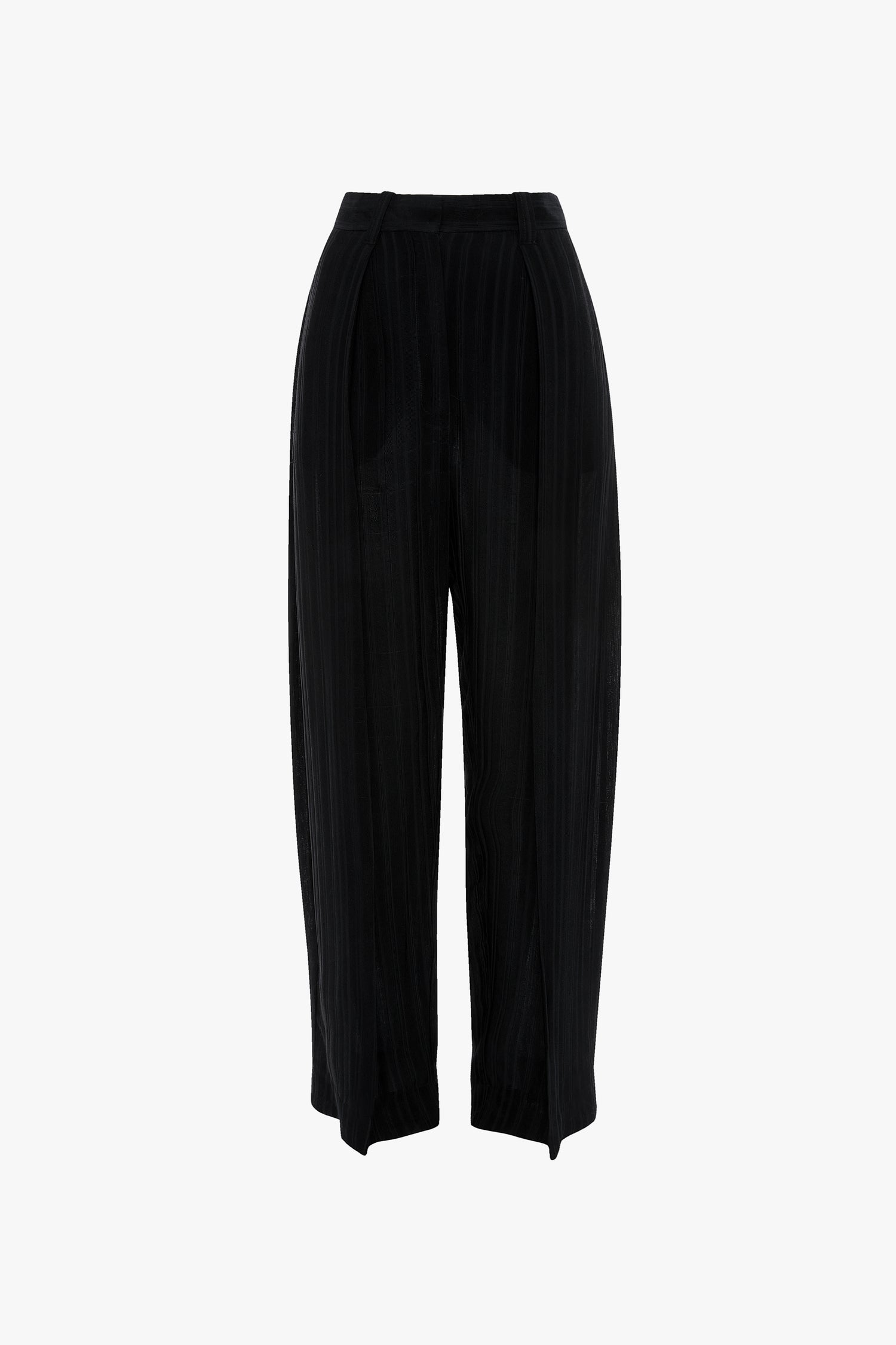 A ribbed jacquard fabrication brings a tactile finish to the Wide Leg Trouser. Presented in versatile Navy, it has a high-rise cut with flattering front pleats and side pockets for a masculine undertone. Traditional back jet pockets and belt loops complete the look.