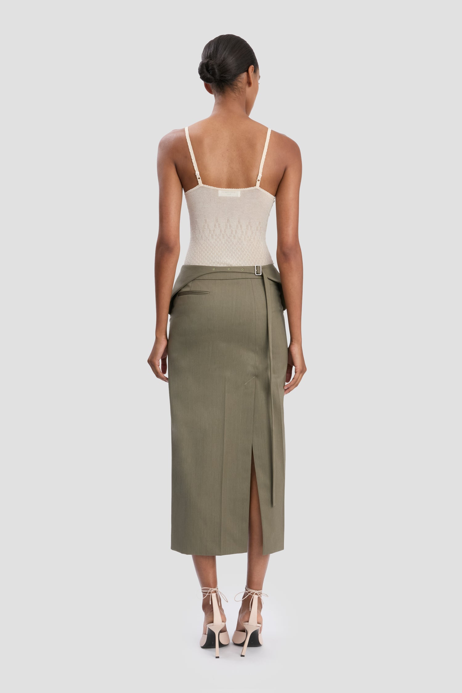 Crafted from a wool melange and fully lined, the Wrap Skirt in Sage is a sophisticated proposition. A faux wrap detail at the front adds visual interest, while a back belt ensures a neat silhouette. Back double welt pockets complete the look.
